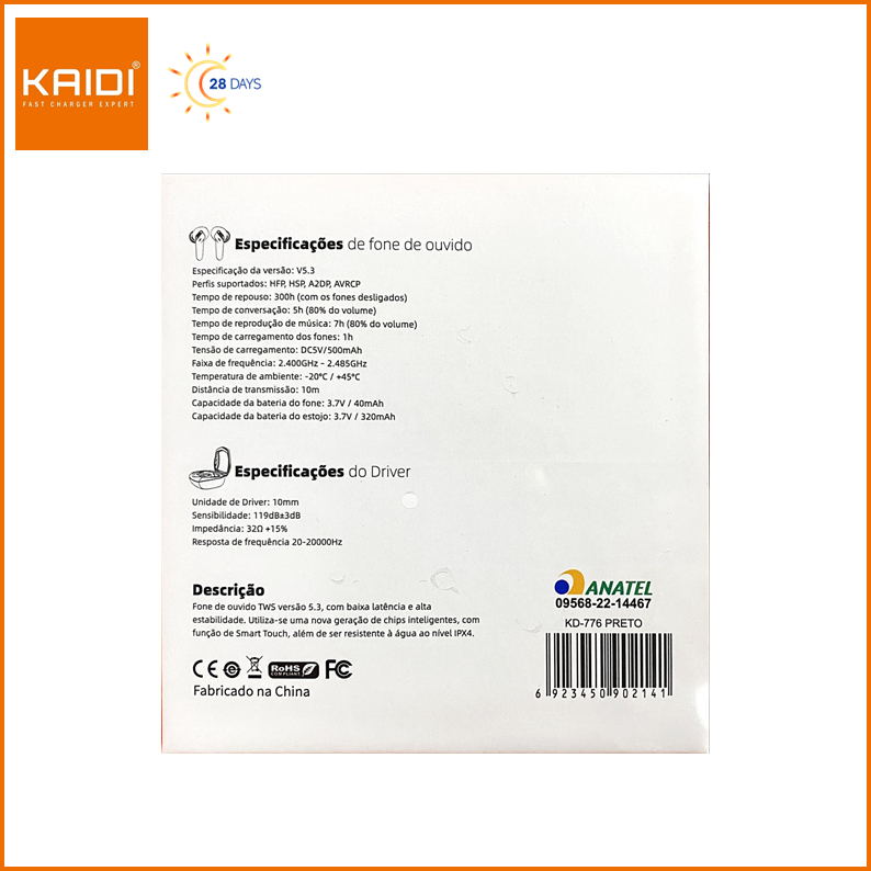 Fone de Ouvido Sem fio Bluetooth TWS Gamer Kaidi KD-776