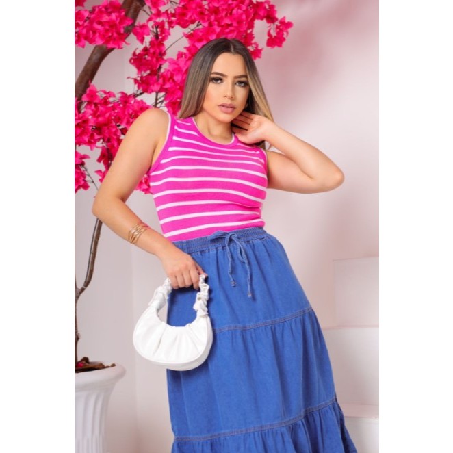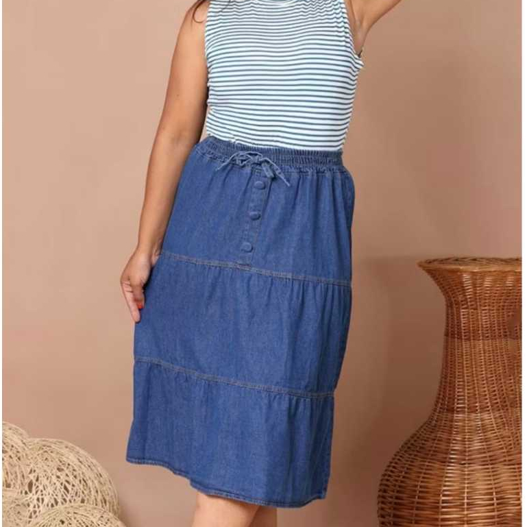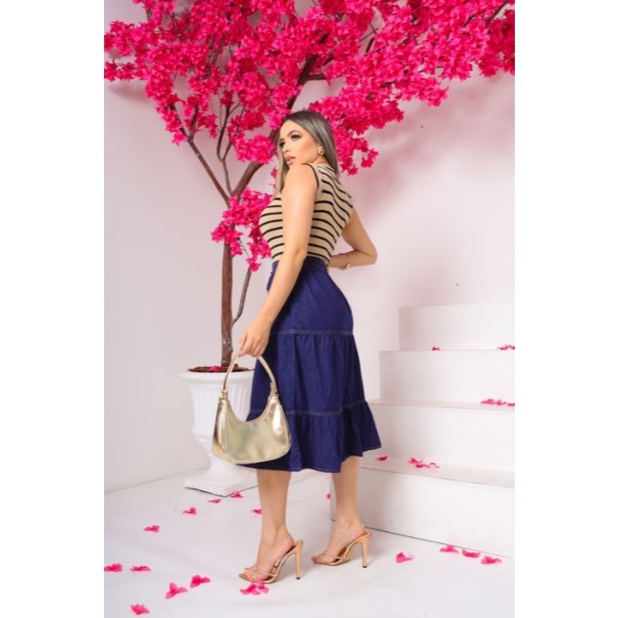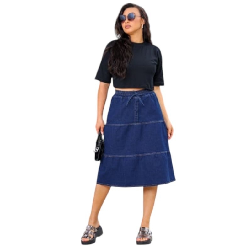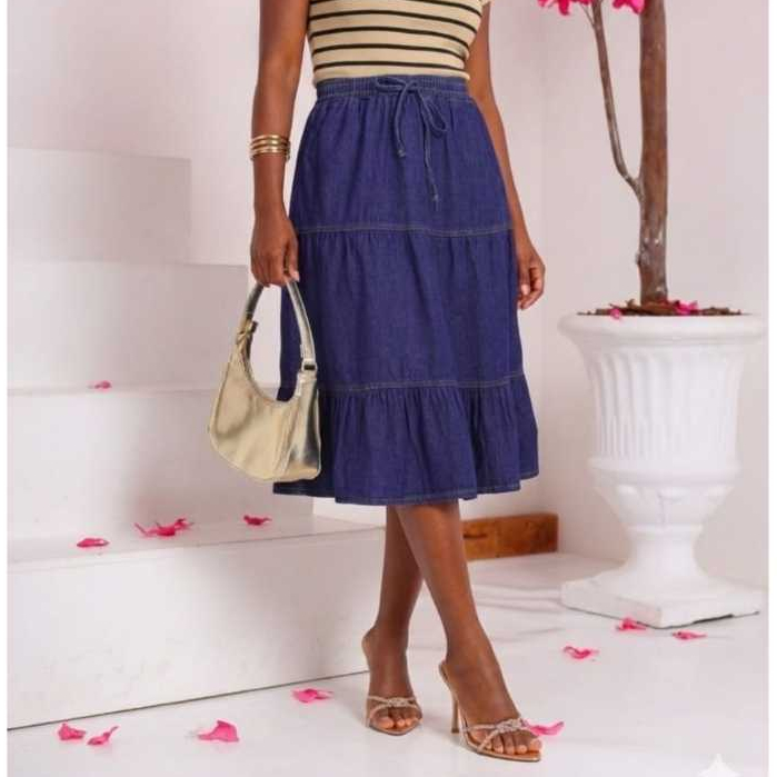 Saia Jeans Moda Evangélica 3 marias midi com elastico na cintura