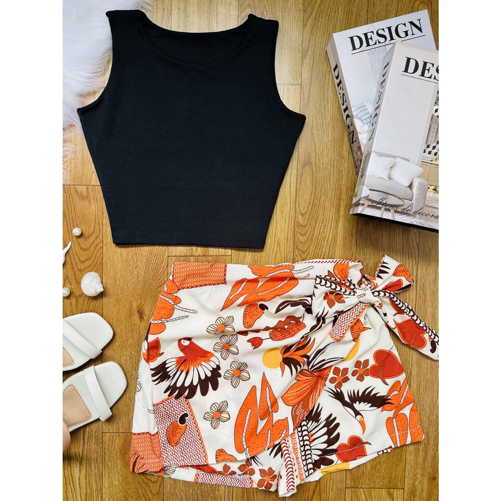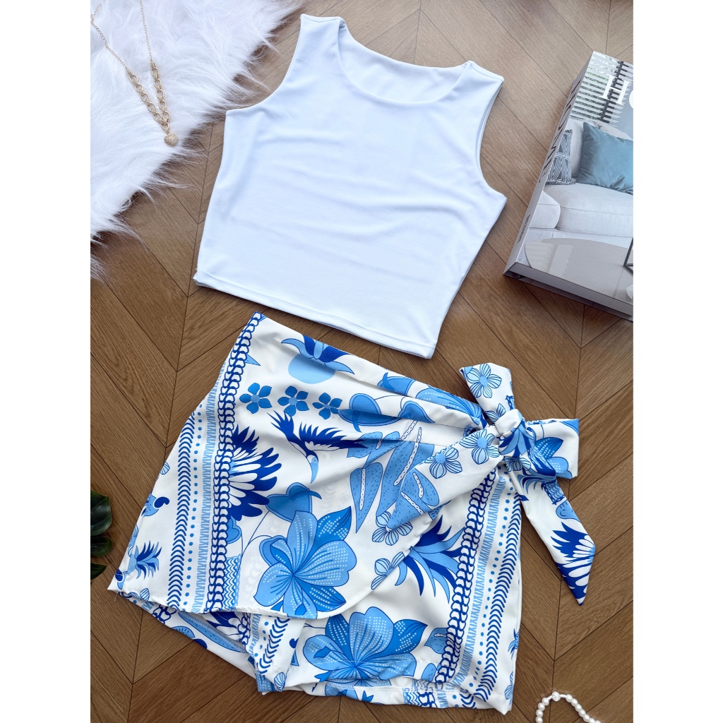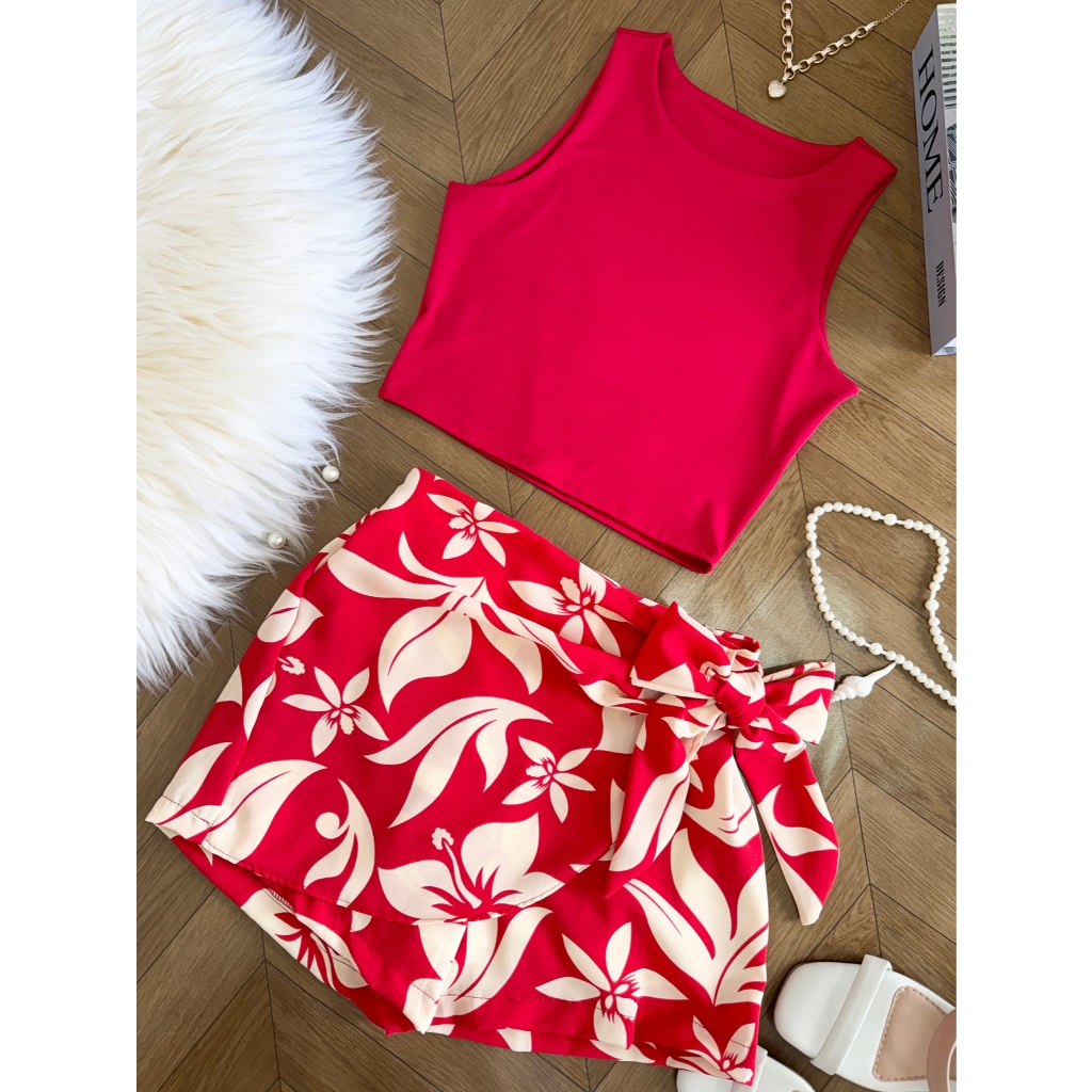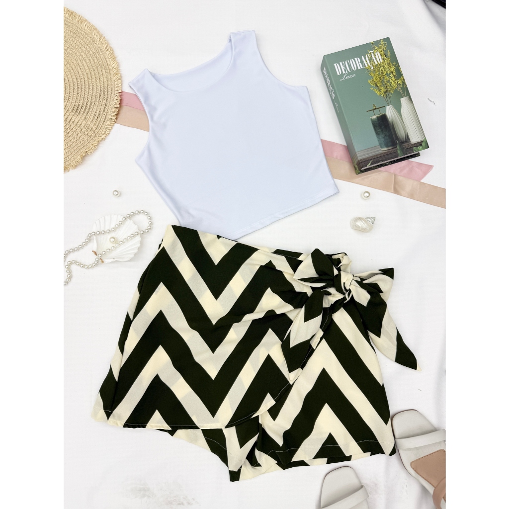 LCQ Conjunto 2pcs de cropped suplex com saia com short com forrado\estampado\moda feminina 100