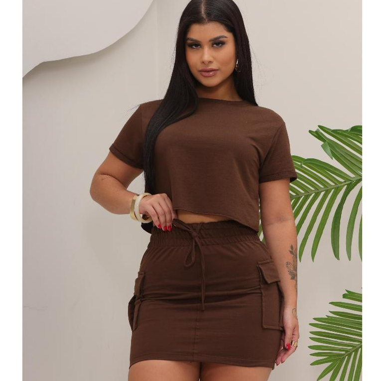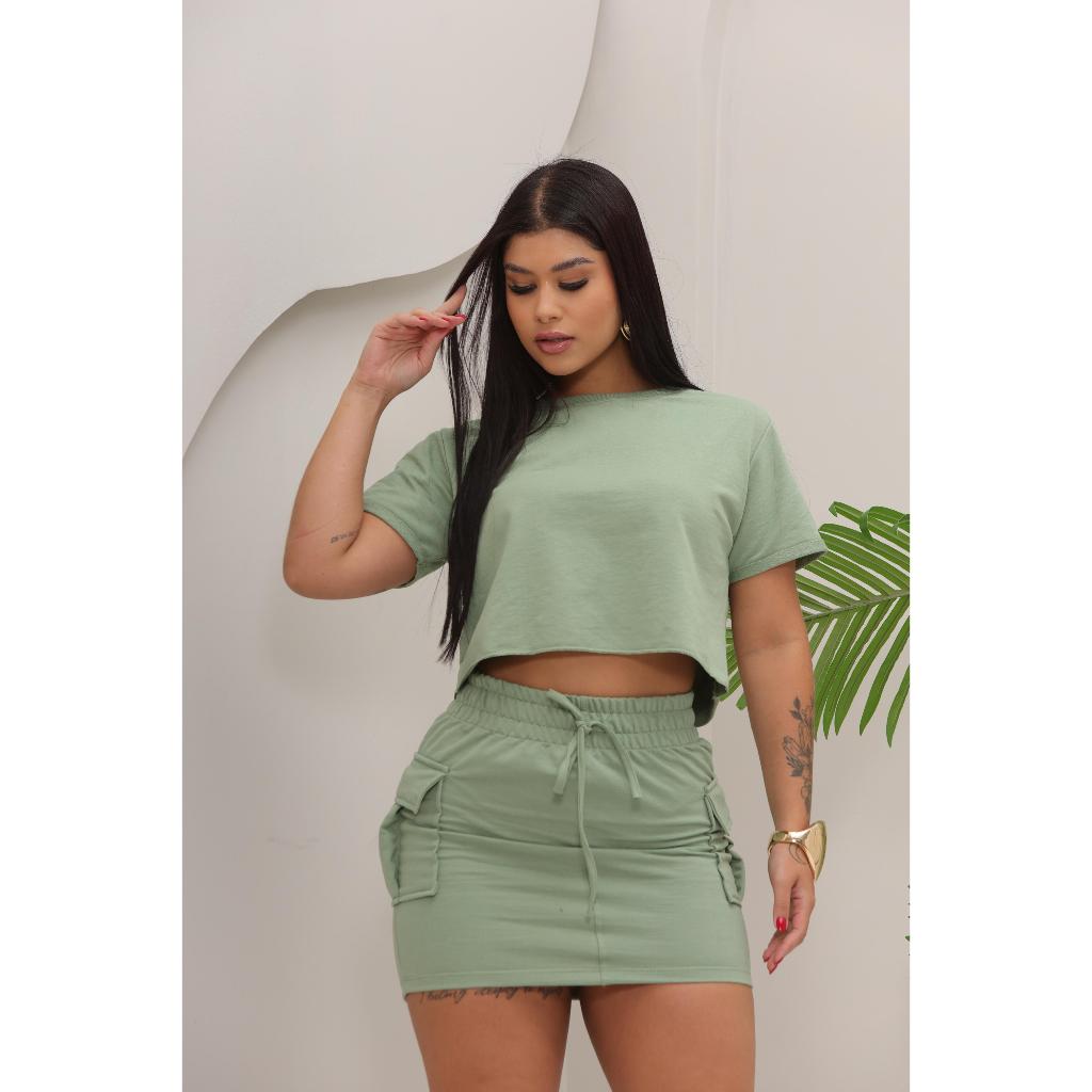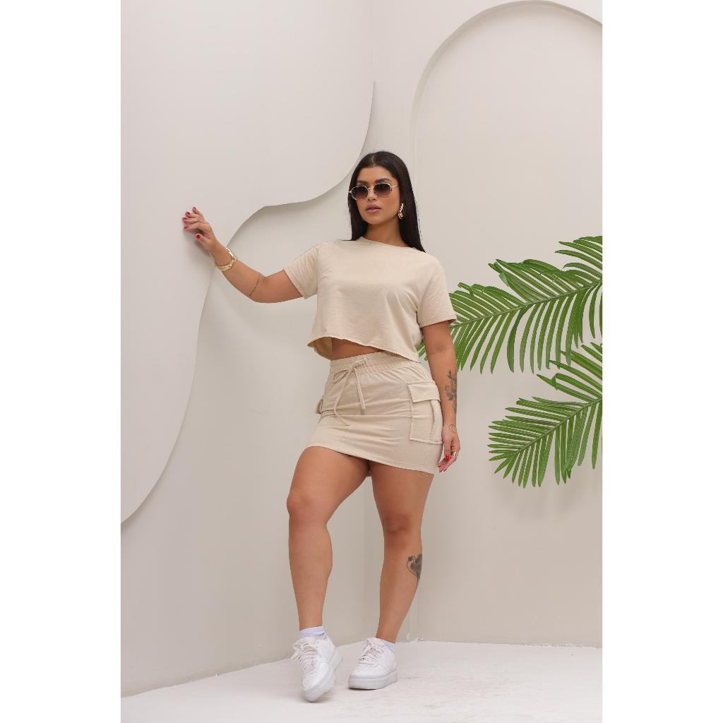 Conjunto Feminino Saia Cargo Moletinho Leve com Cropped Casual Moda Verão Luxo Confortável