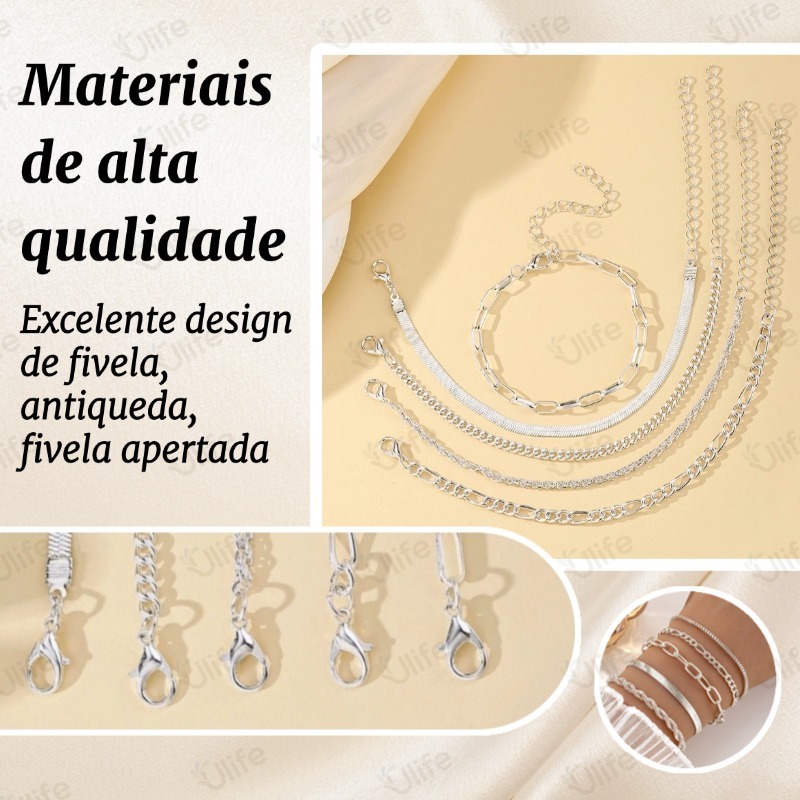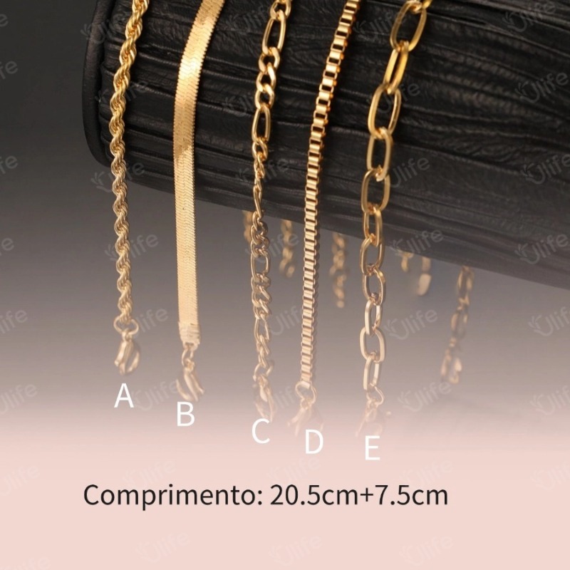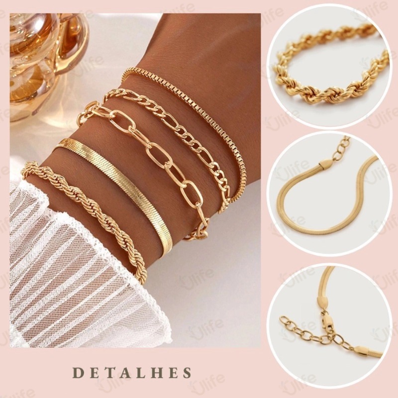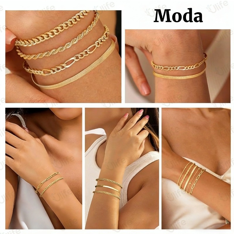 Conjunto De Pulseiras Minimalistas Boêmia 5pcs-Correntes Metálicas , Múltiplas Camadas, Presentes para Mulheres-UF