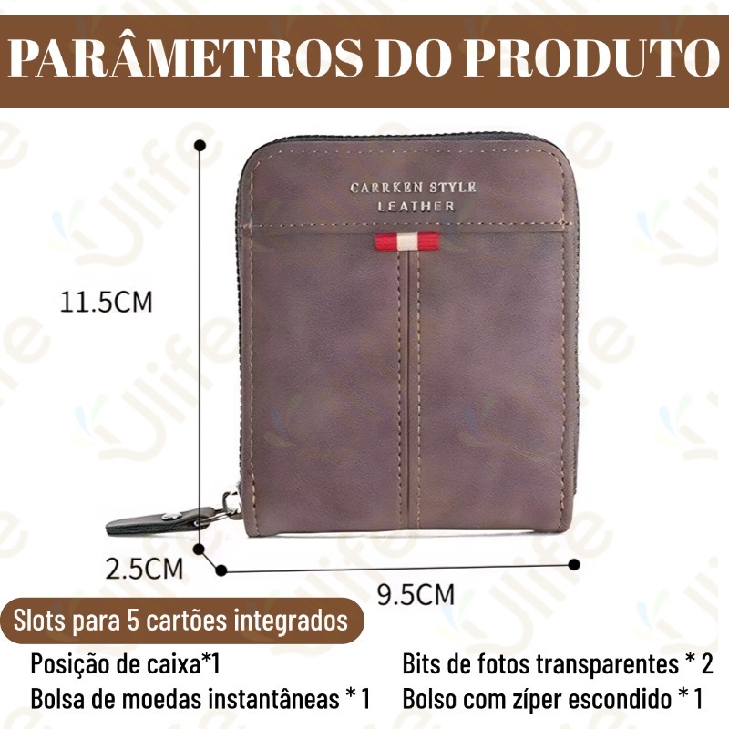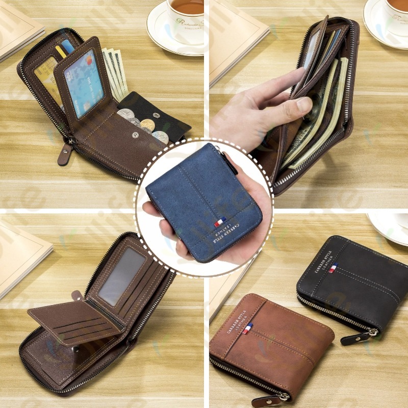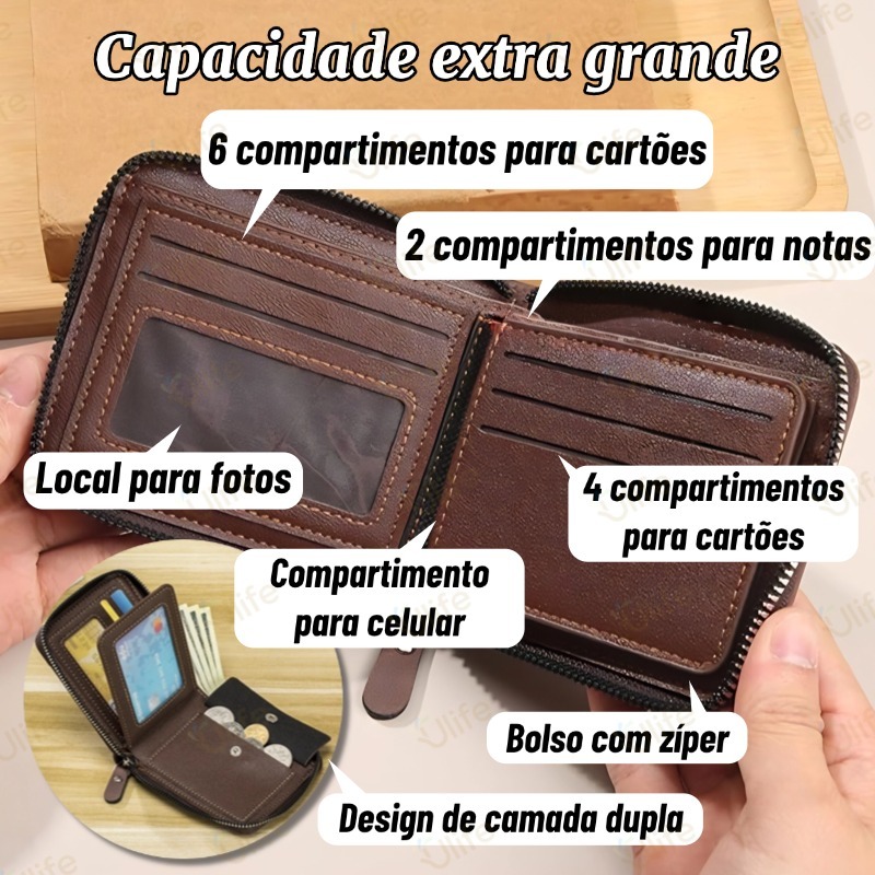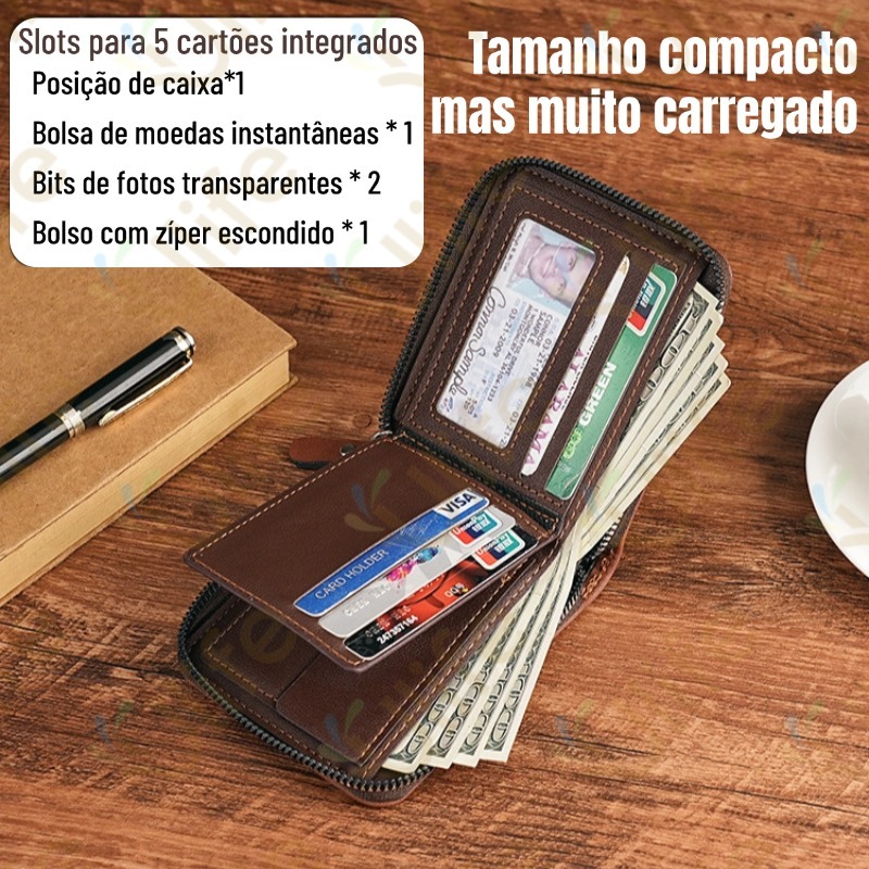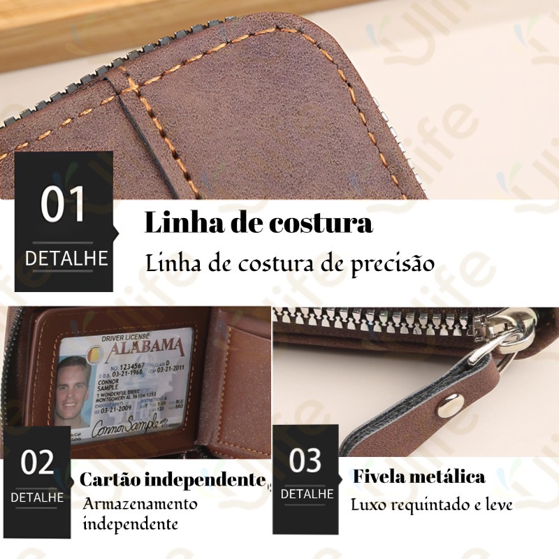 Carteira masculina couro PU com porta documentos com fecho cor preta Azul Café Escuro-UF