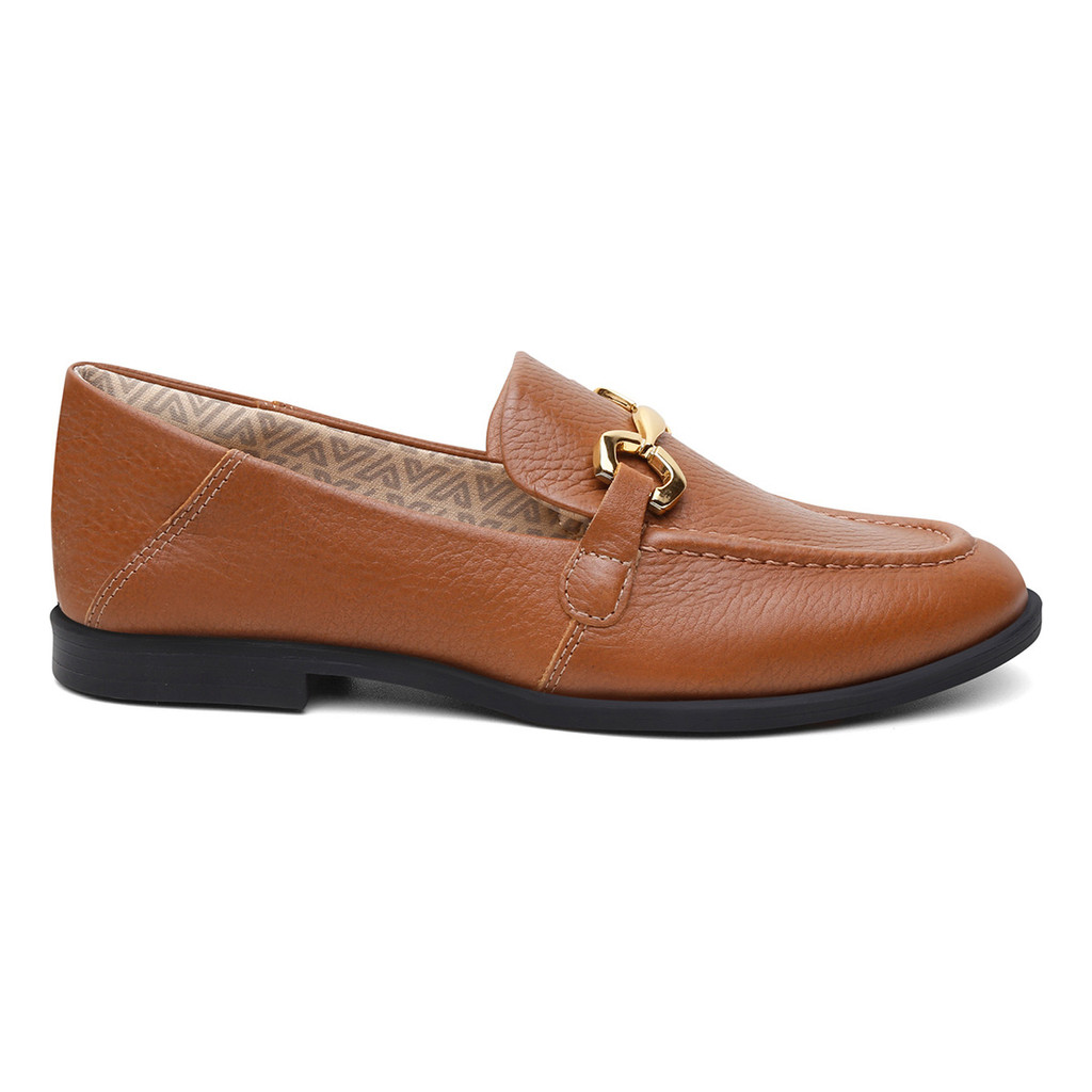 Mocassim Mara Caramelo Feminino Vittal Couro Legítimo Metal Dourado Leve Macio Elegante
