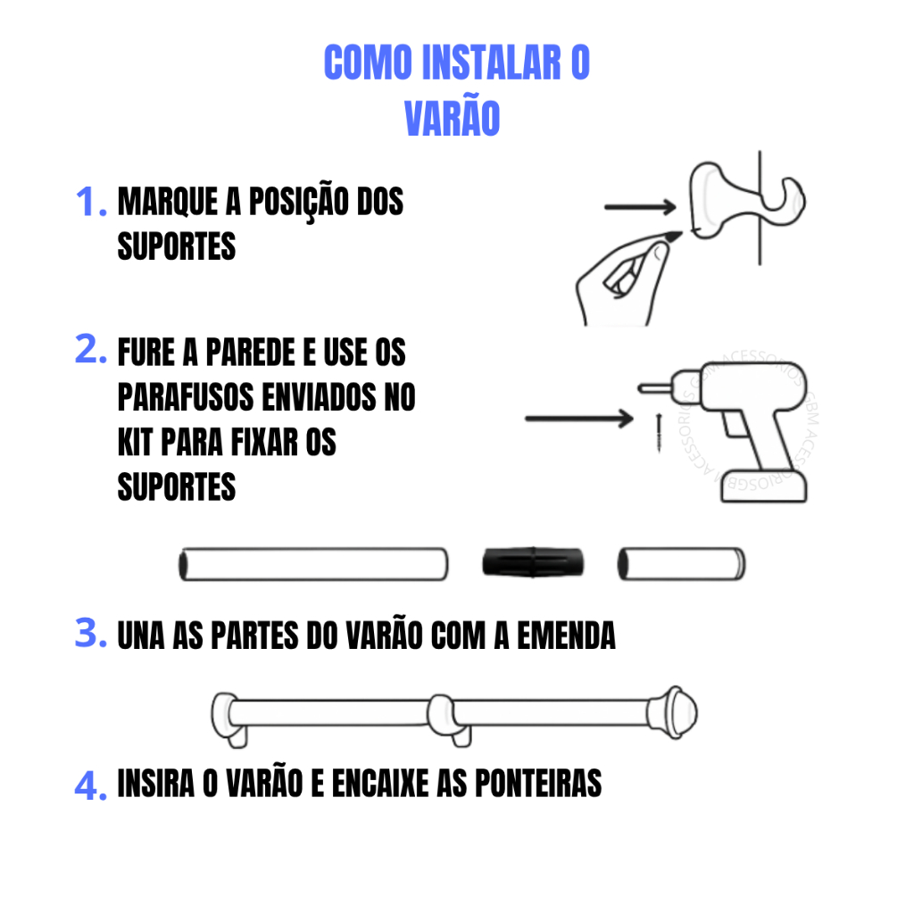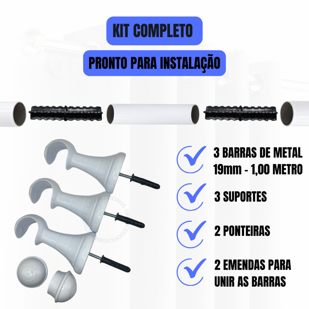 Kit Varão Cortina 3,00 Metros 19mm Varias Cores Simples