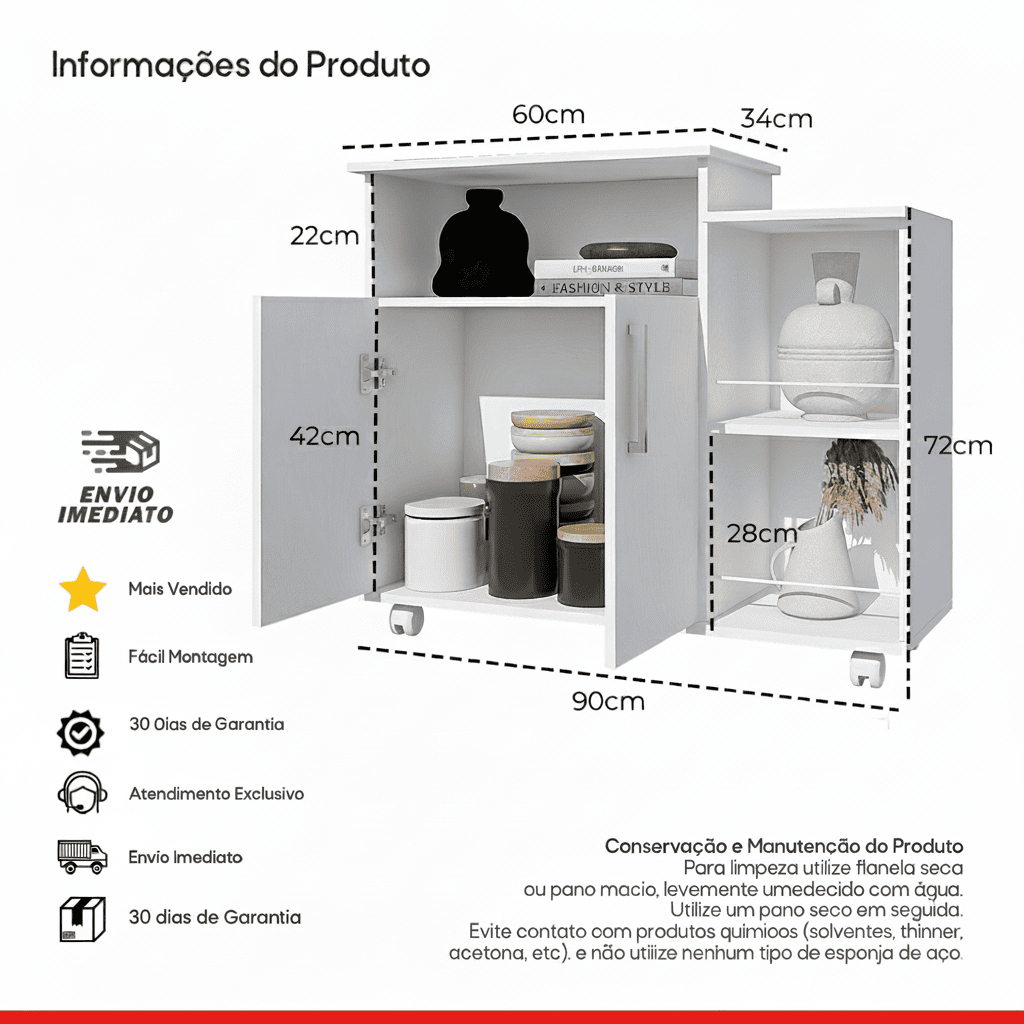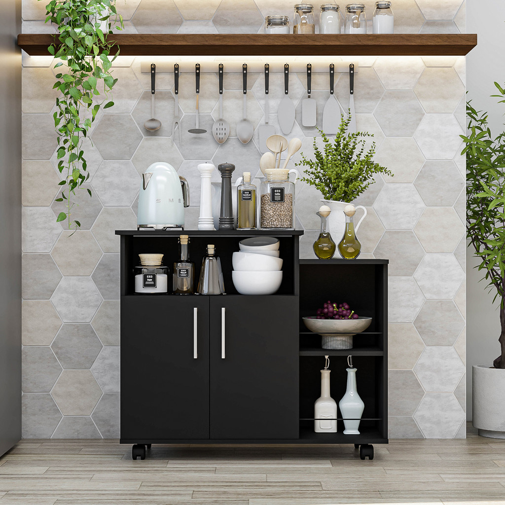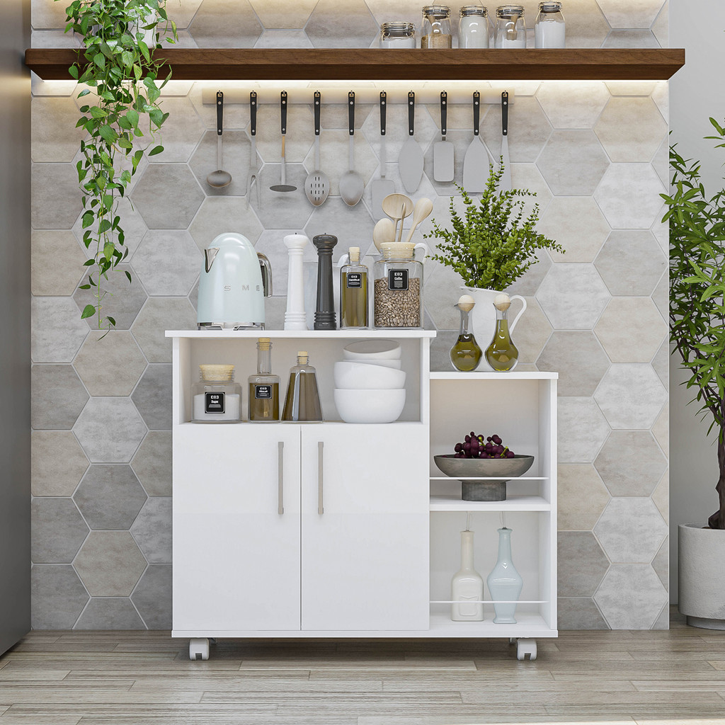 Balcão Organizador 2 Portas e Prateleiras Multiuso Com Rodinhas Armário Cozinha Compacta