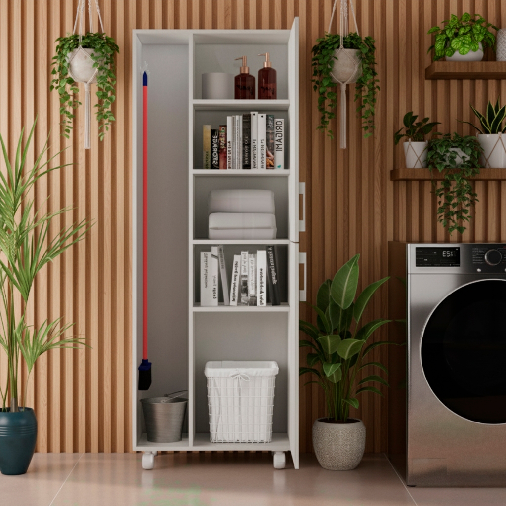 Armario Multiuso 2 Portas com Rodízios e Porta Vassouras Organizador Lavanderia 5 Prateleiras