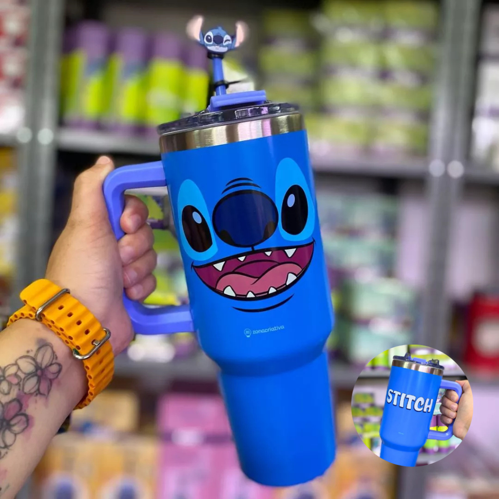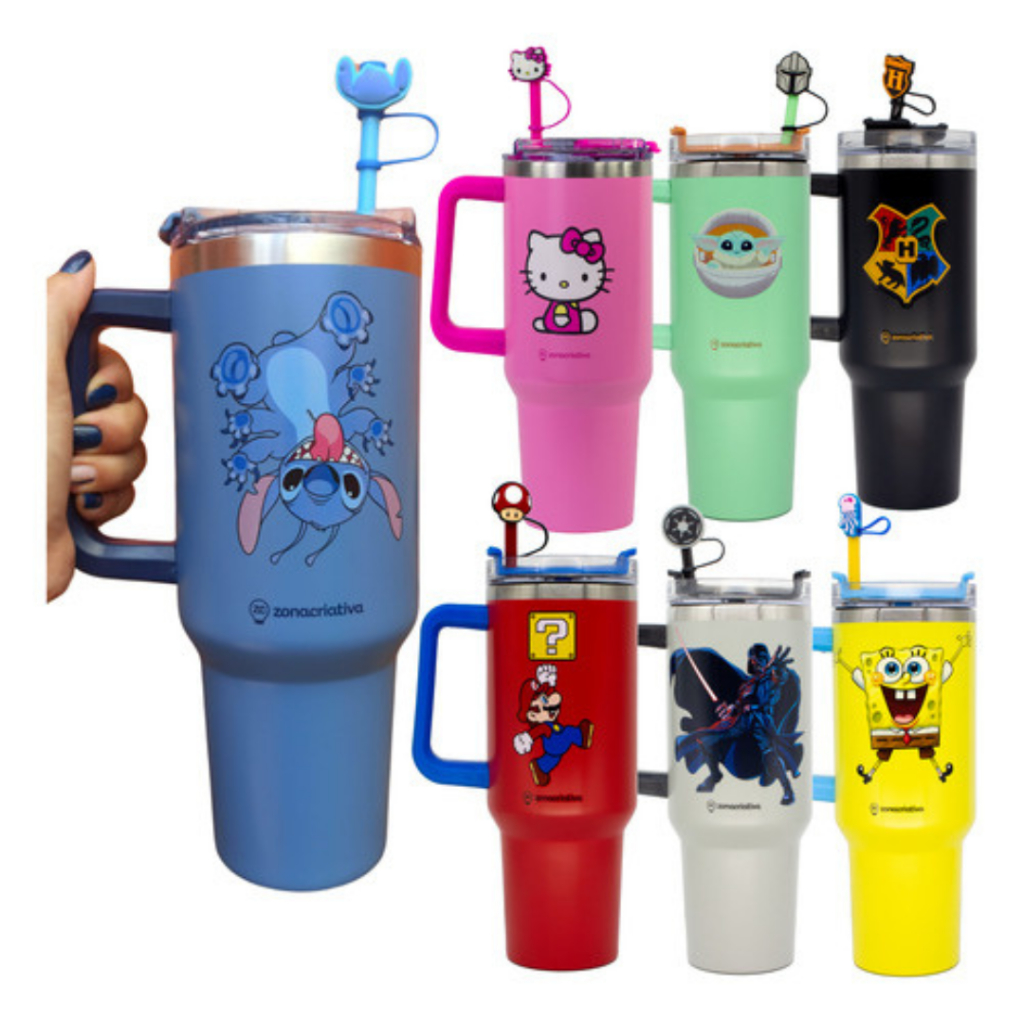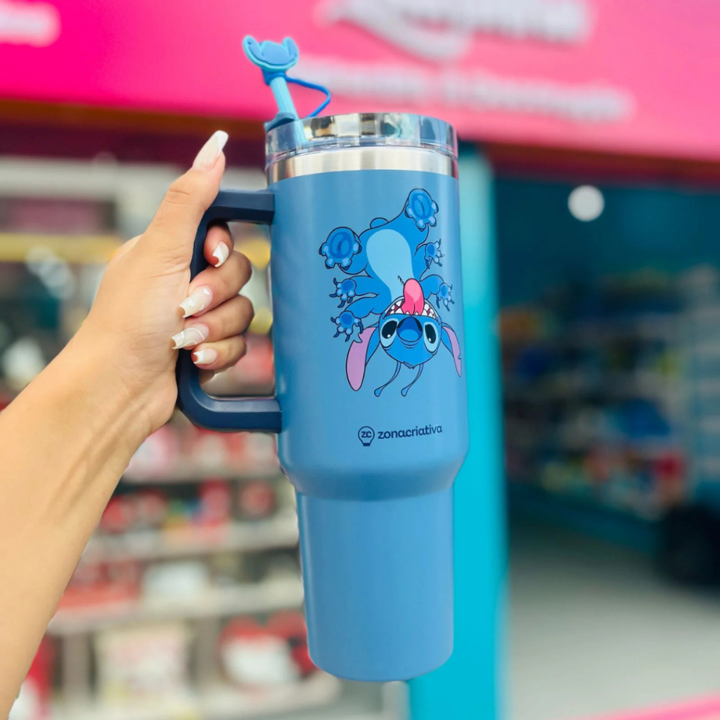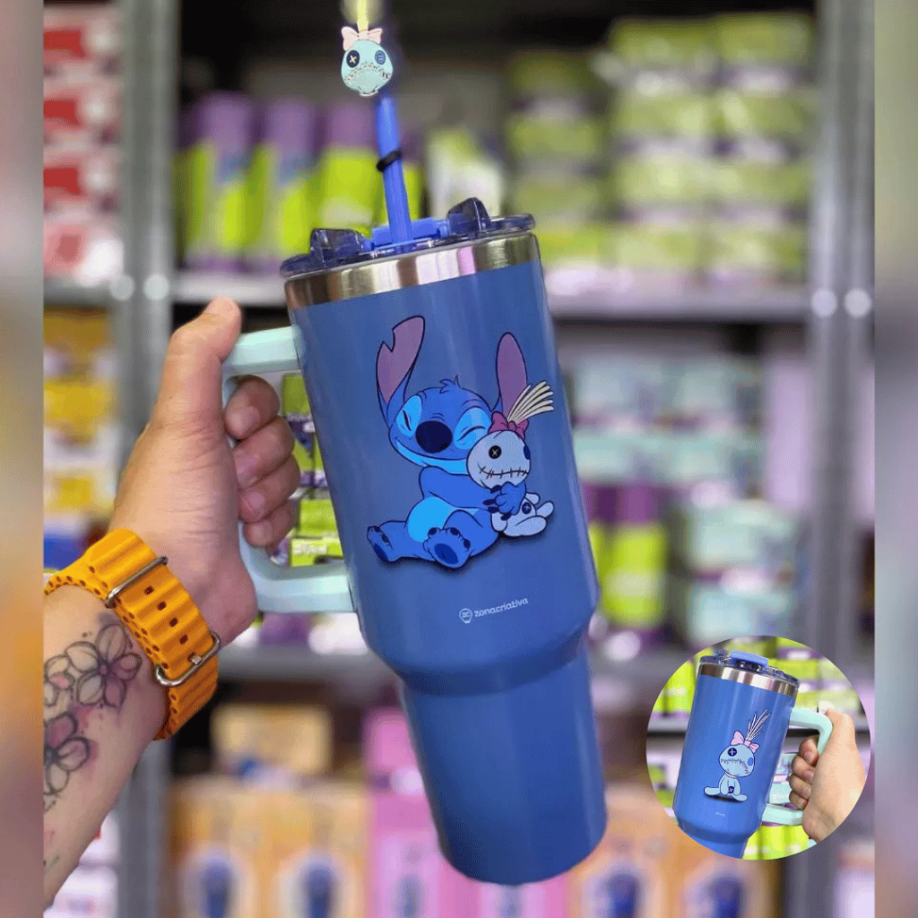 Copão Garrafa Tumbler Zona Criativa Com Canudo e Pingente Stitch Harry Potter Bob Esponja Hello Kitty Disney Original