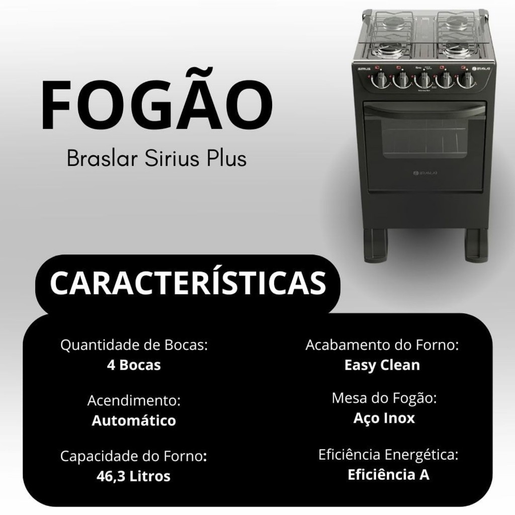 Fogão de Piso Braslar Sirius Plus 4 Bocas - Bivolt com Acendimento Automático