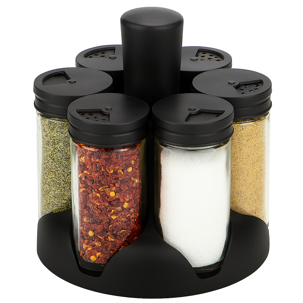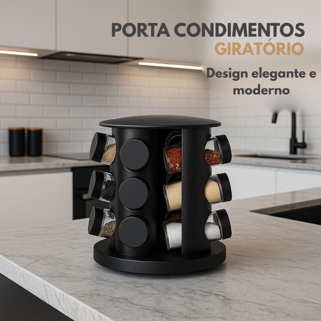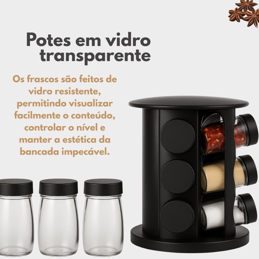 Porta Tempero Condimentos Giratório com 9 Potes de Vidro Preto 360 Graus com Tampa Dosadora