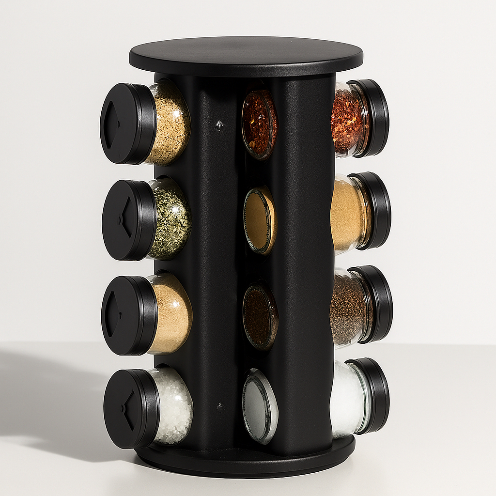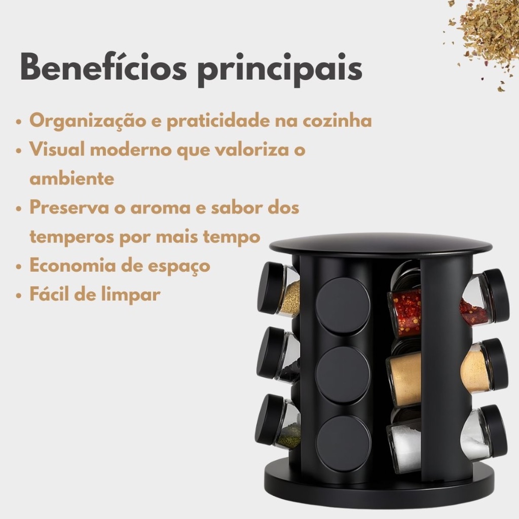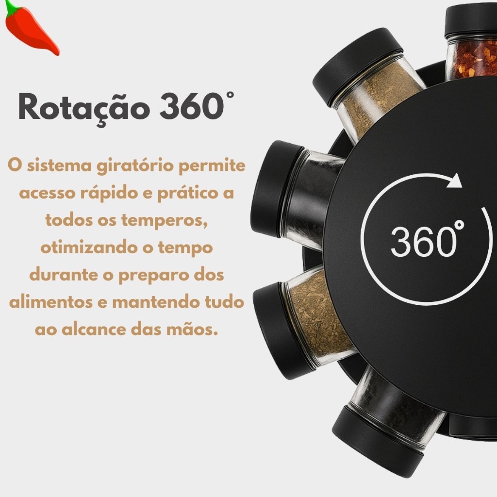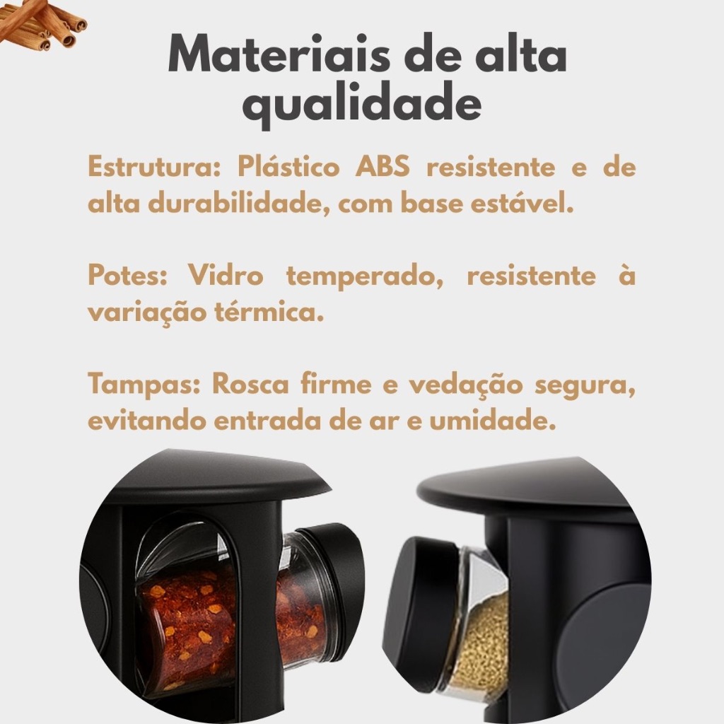 Porta Tempero Condimentos Giratório com 9 Potes de Vidro Preto 360 Graus com Tampa Dosadora