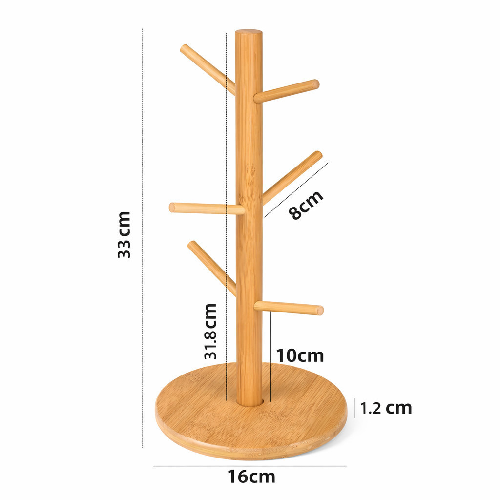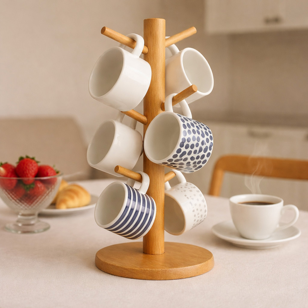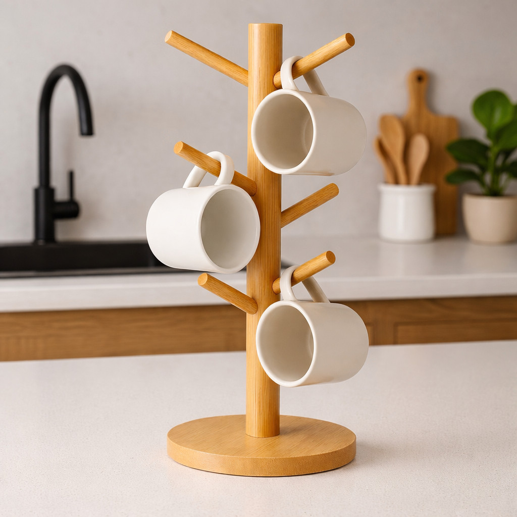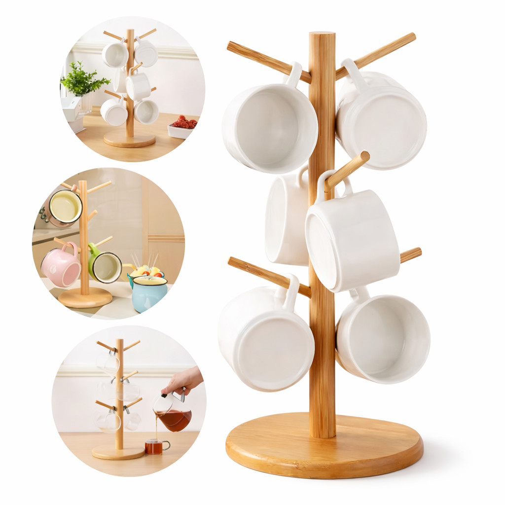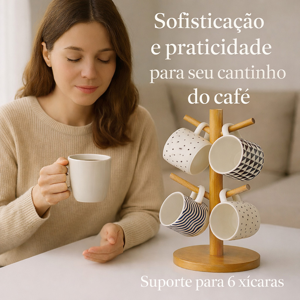 Suporte Porta Xícaras Organizador Em Bambu 6 Ganchos Guardar Xícara Mesa Posta