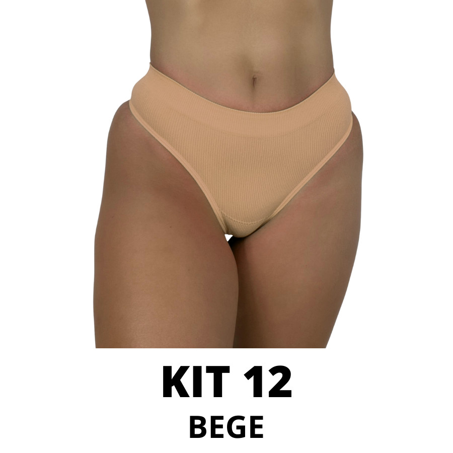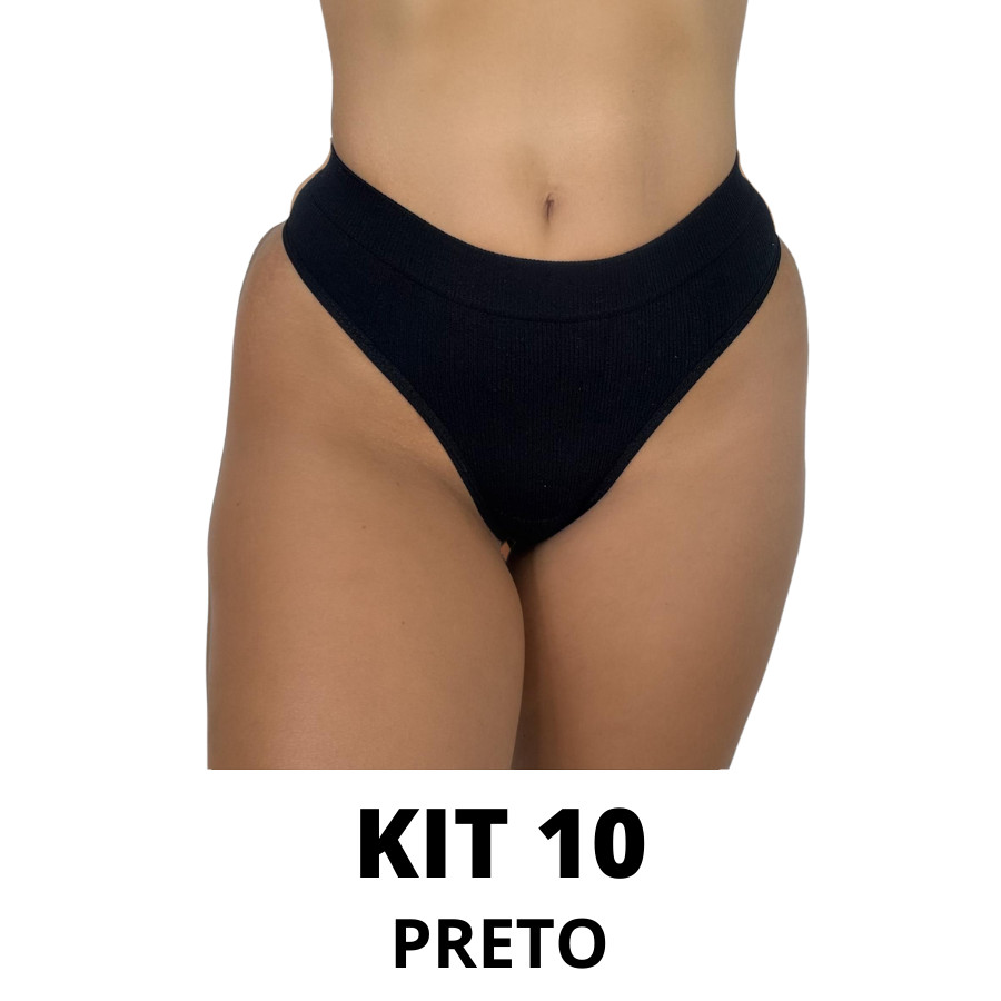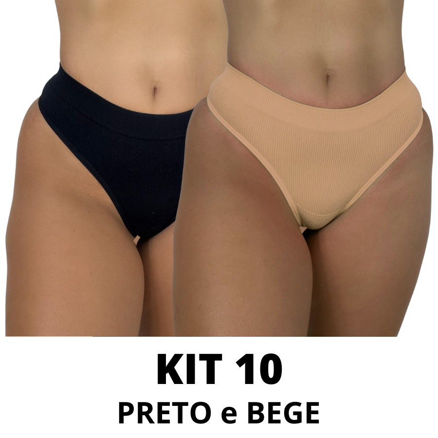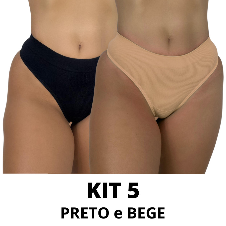 Kit Calcinhas Canelada Importada Preto e Bege Fio Tanga Cintura Alta Pala Dupla