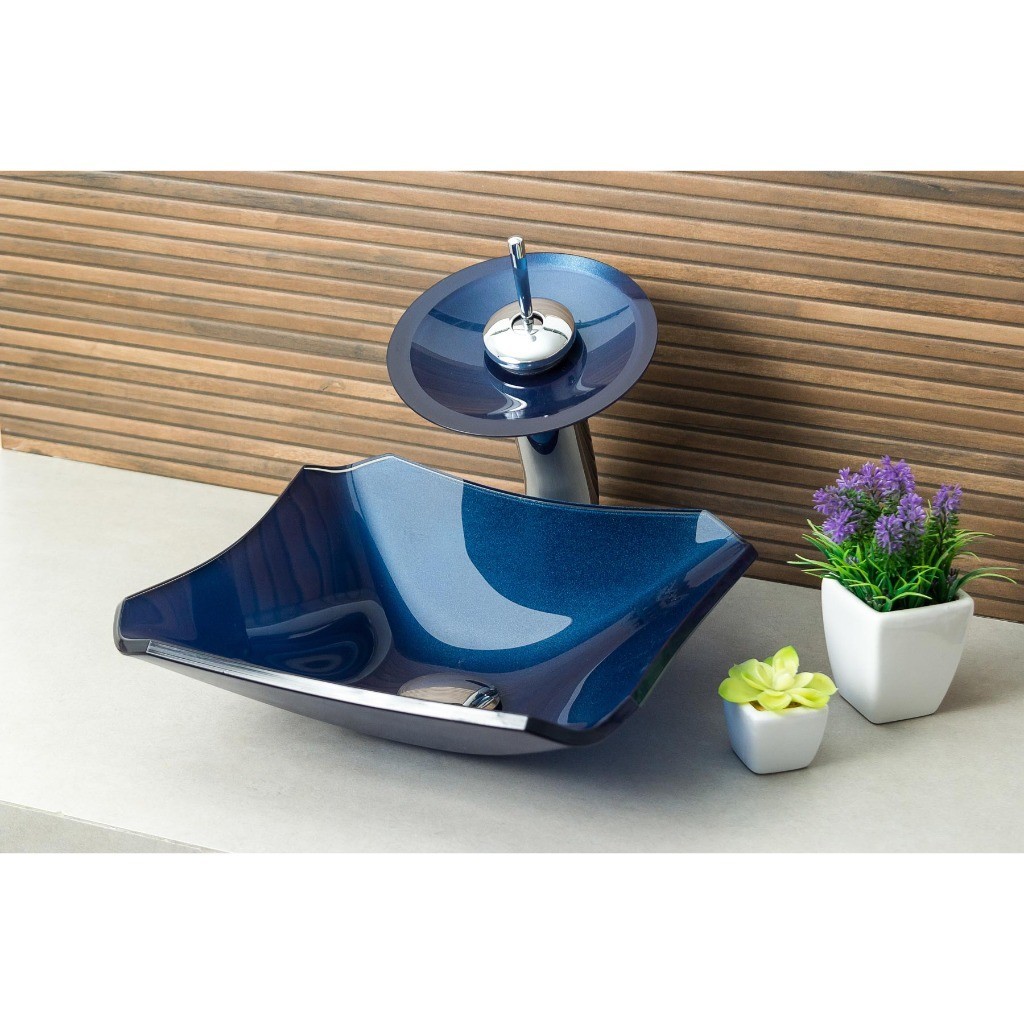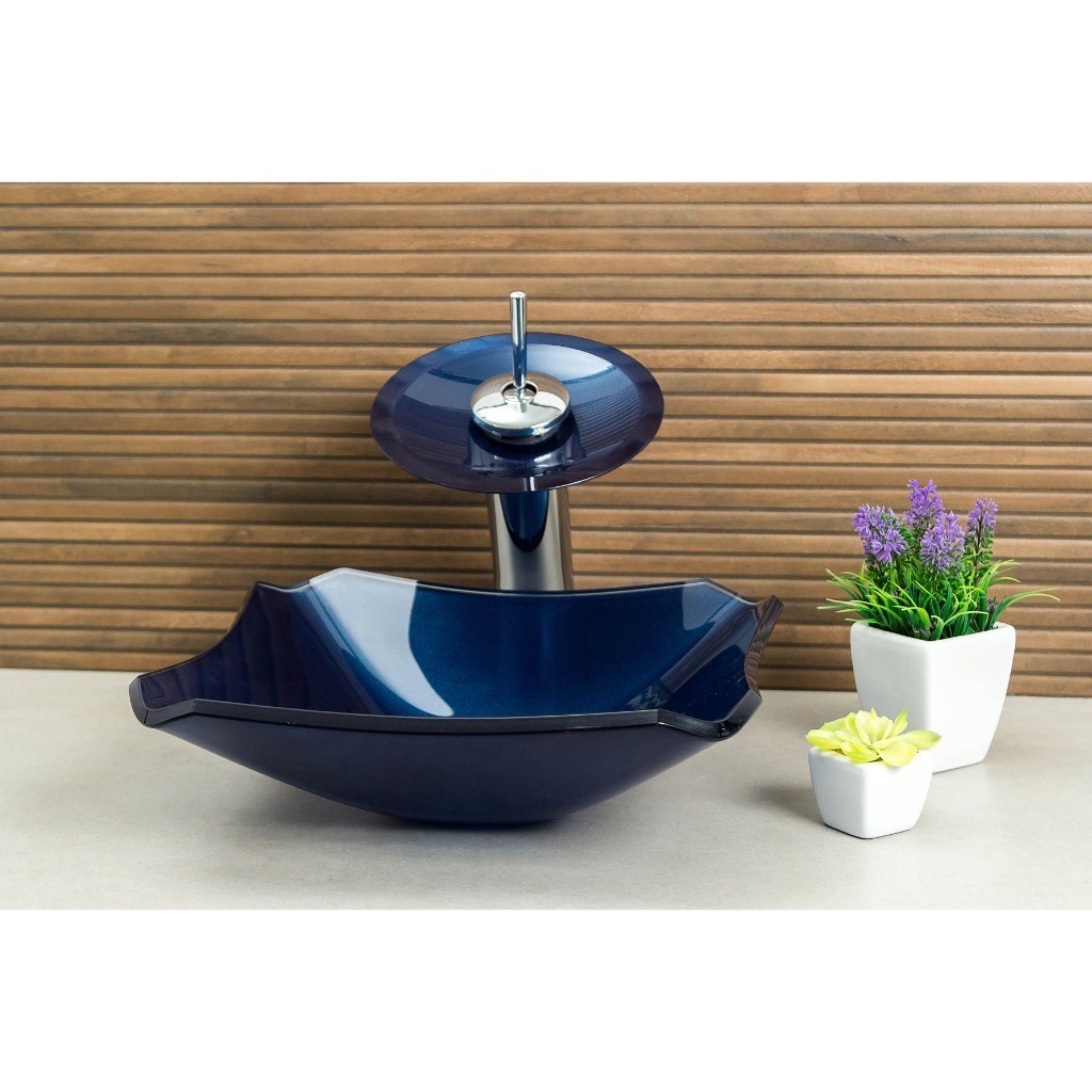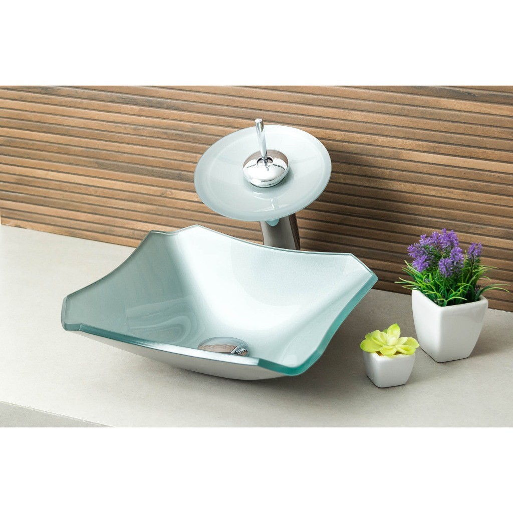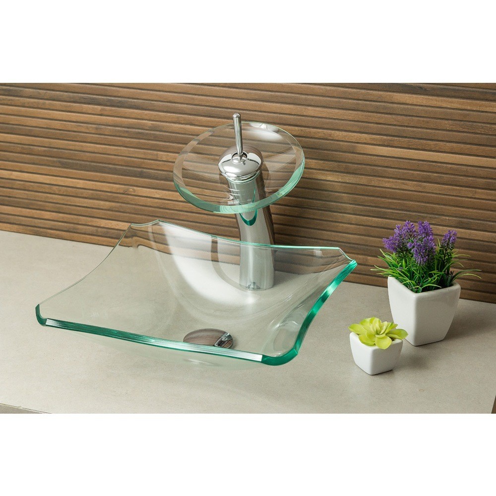 CONJUNTO CUBA BANHEIRO LAVABO RETRÔ 33CM VIDRO + TORNEIRA CASCATA E VÁLVULA CLICK INOX