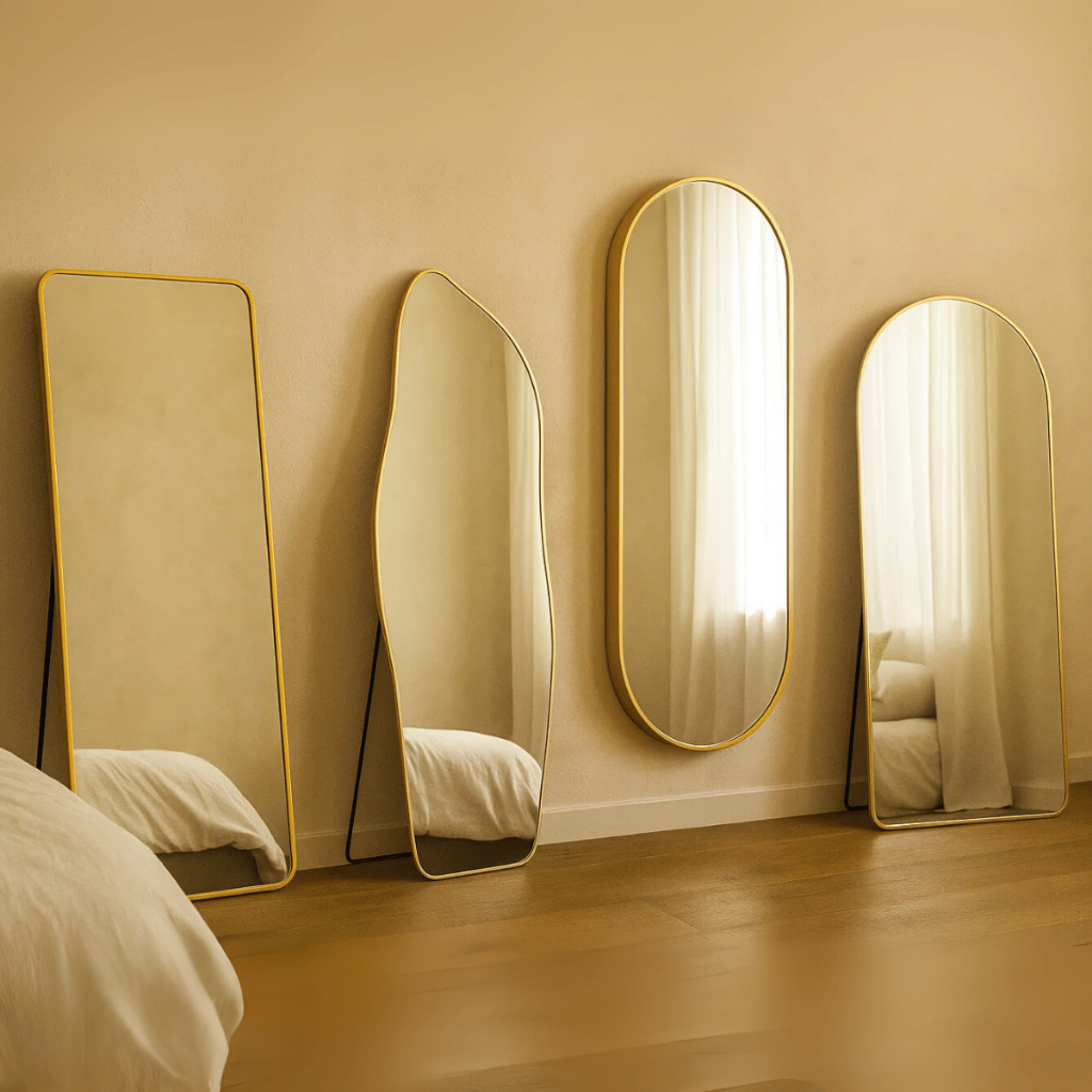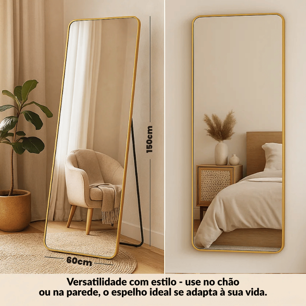 Espelho Corpo Inteiro Orgânico 150x60cm Flame Retangular Oval Base Reta Dourado Com Suporte de Chão