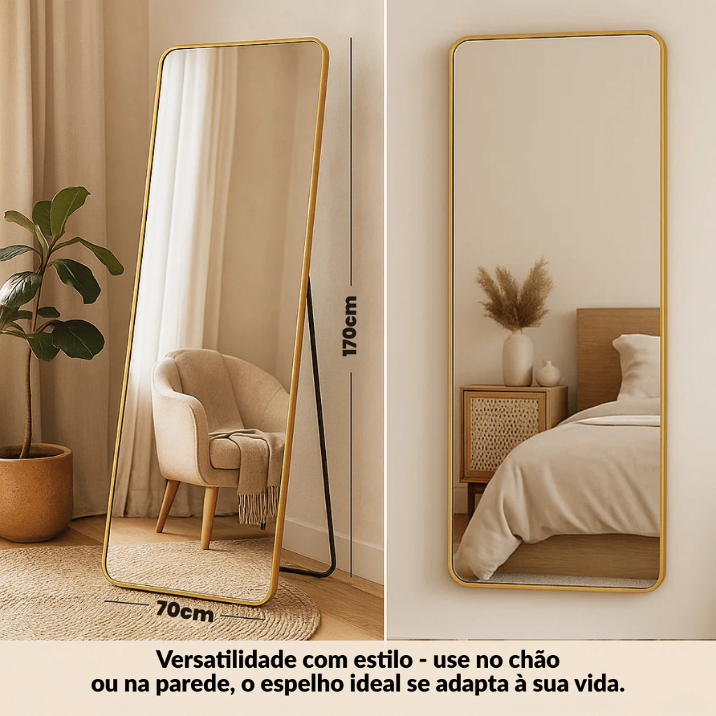 Espelho Corpo Inteiro Orgânico 170x70cm Flame Retangular Oval Base Reta Dourado Com Suporte de Chão