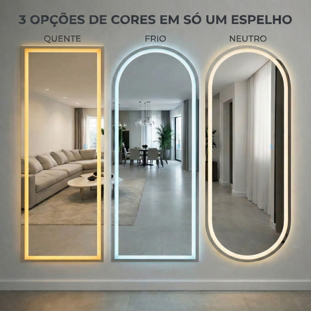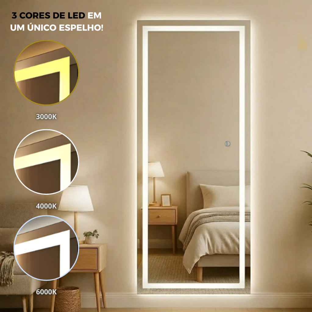 Espelho de Chão ou Parede LED 170x70 Grande Vidro Temperado Touch 3 Cores Luxo Não Distorce Imagem