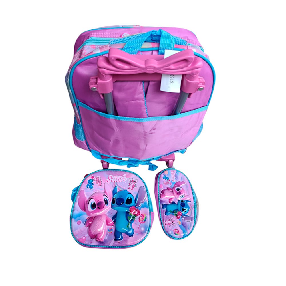 Kit Mochila Stitch e Angel com Rodinhas + Lancheira Térmica + Estojo Escolar Infantil