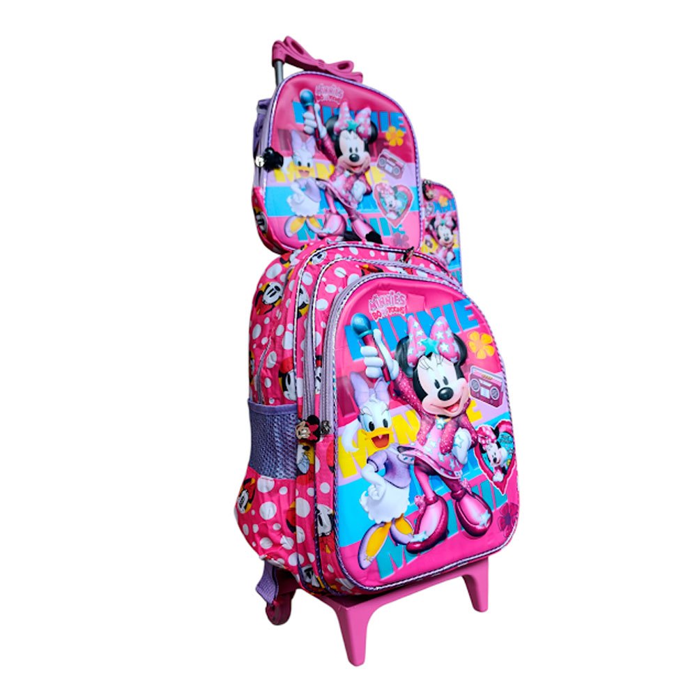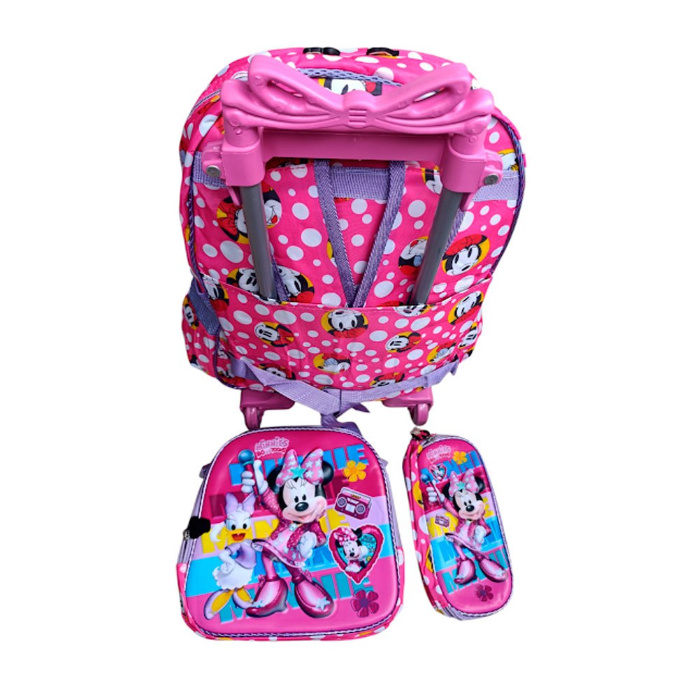 Kit Mochila da Minnie em Alto Relevo 3D com Rodinhas + Lancheira Térmica + Estojo Escolar Infantil