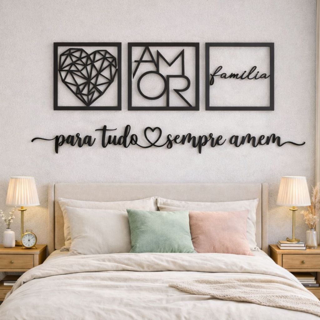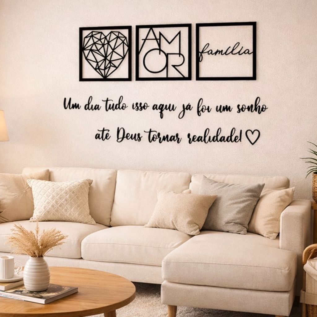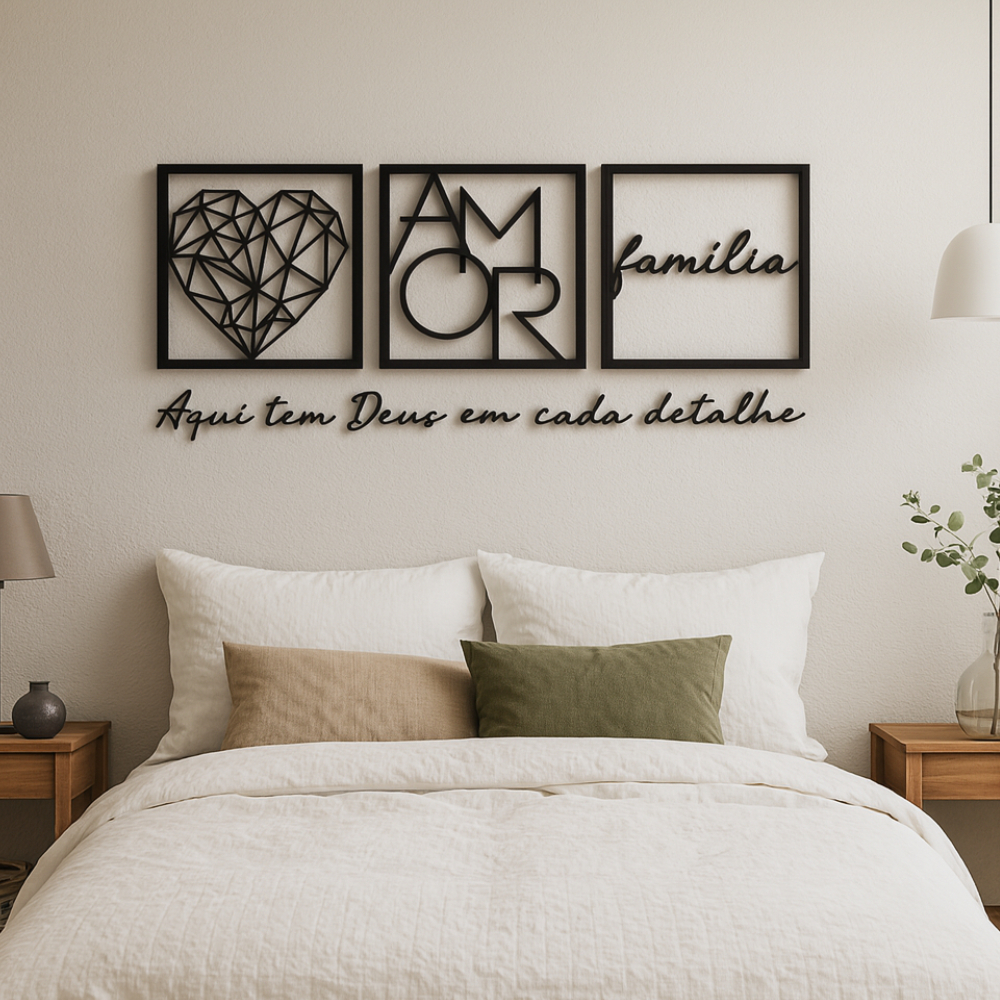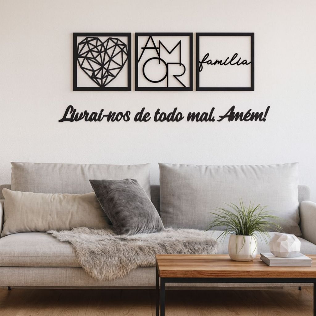 Kit 3 Quadros Cabeceira Familia Coração Geométrico Amor + Frase de Parede Variados Sala
