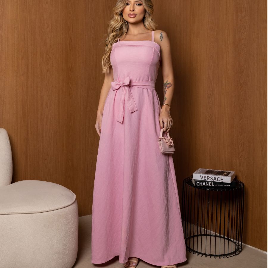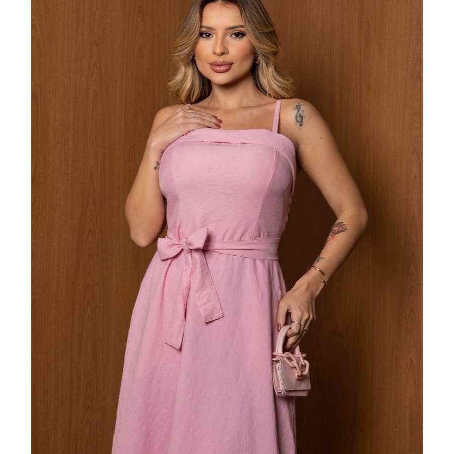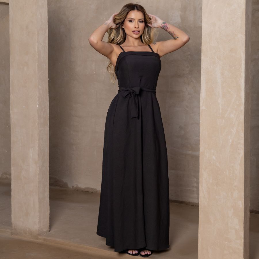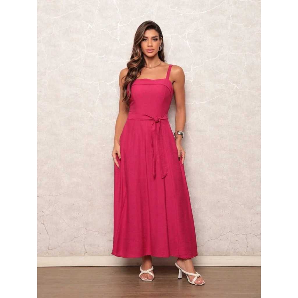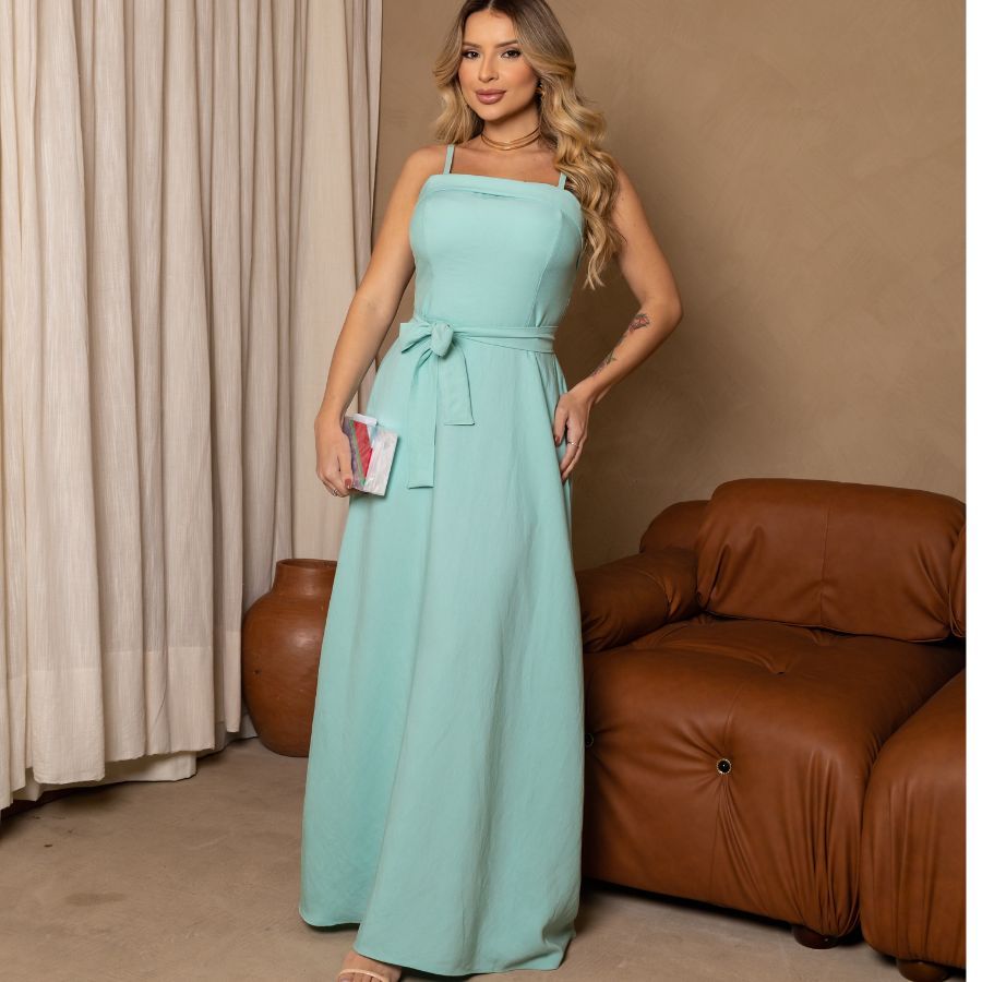 Vestido Elegante com Cinto, Bainha Larga e Bolsos, Tecido Marrant