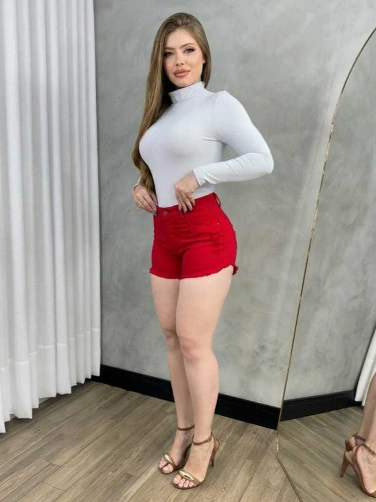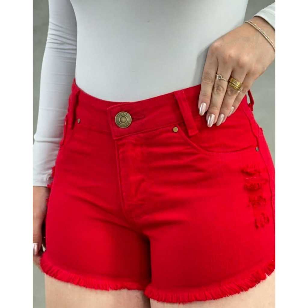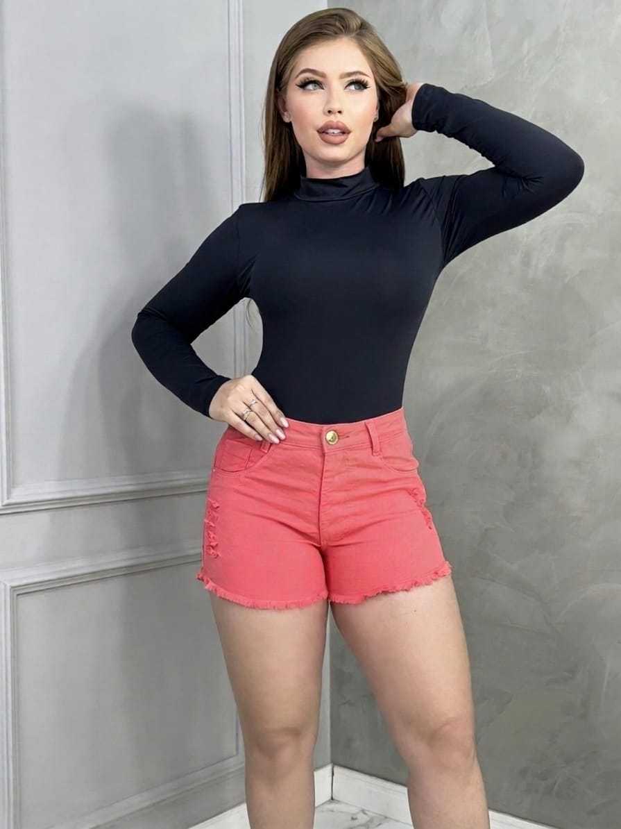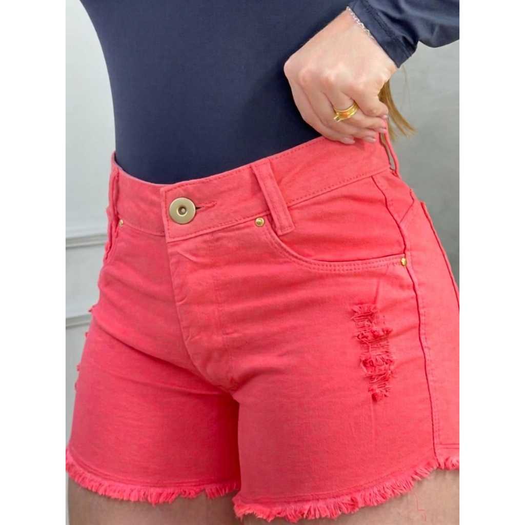 Short Jeans Salmão Feminino Cintura Alta Com Lycra Elastano Rasgado Levanta Bumbum Cós Alto
