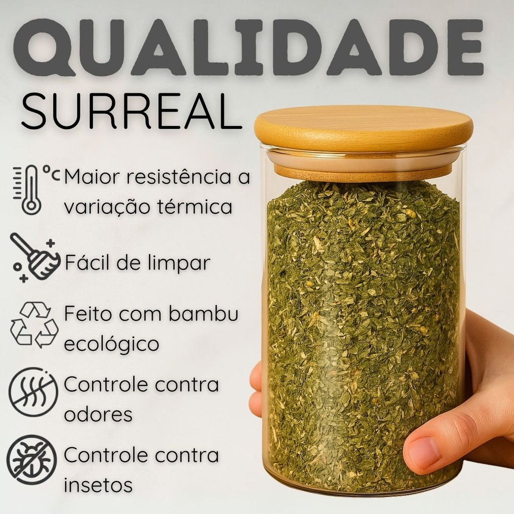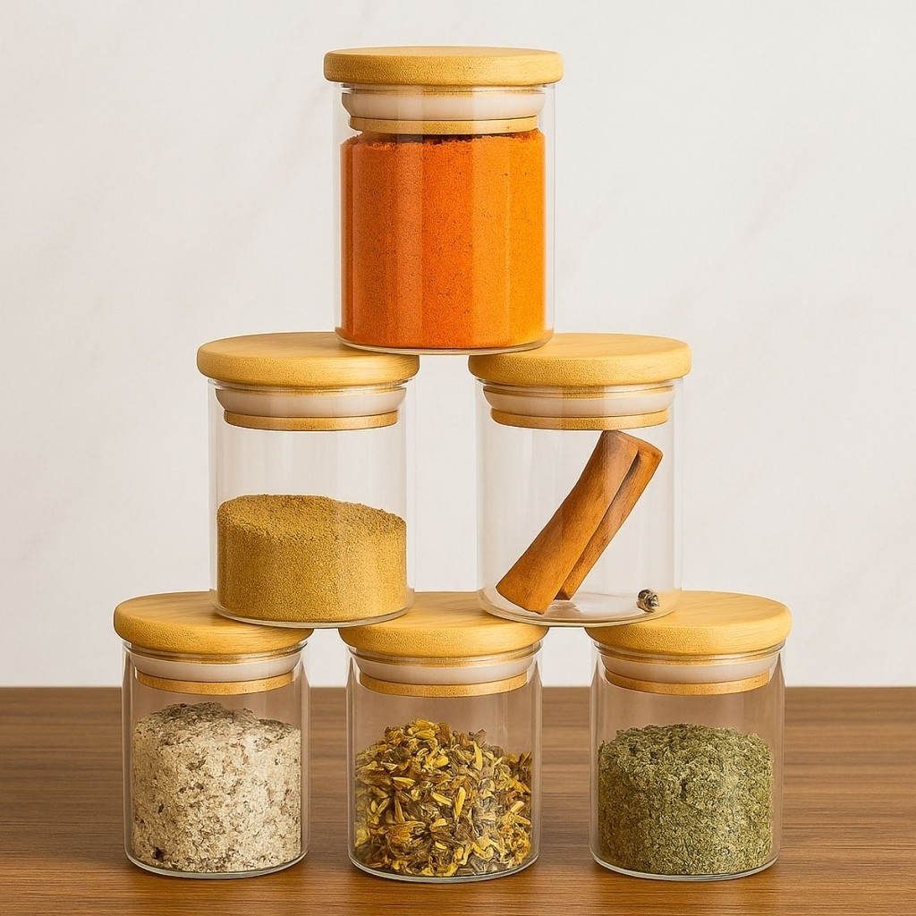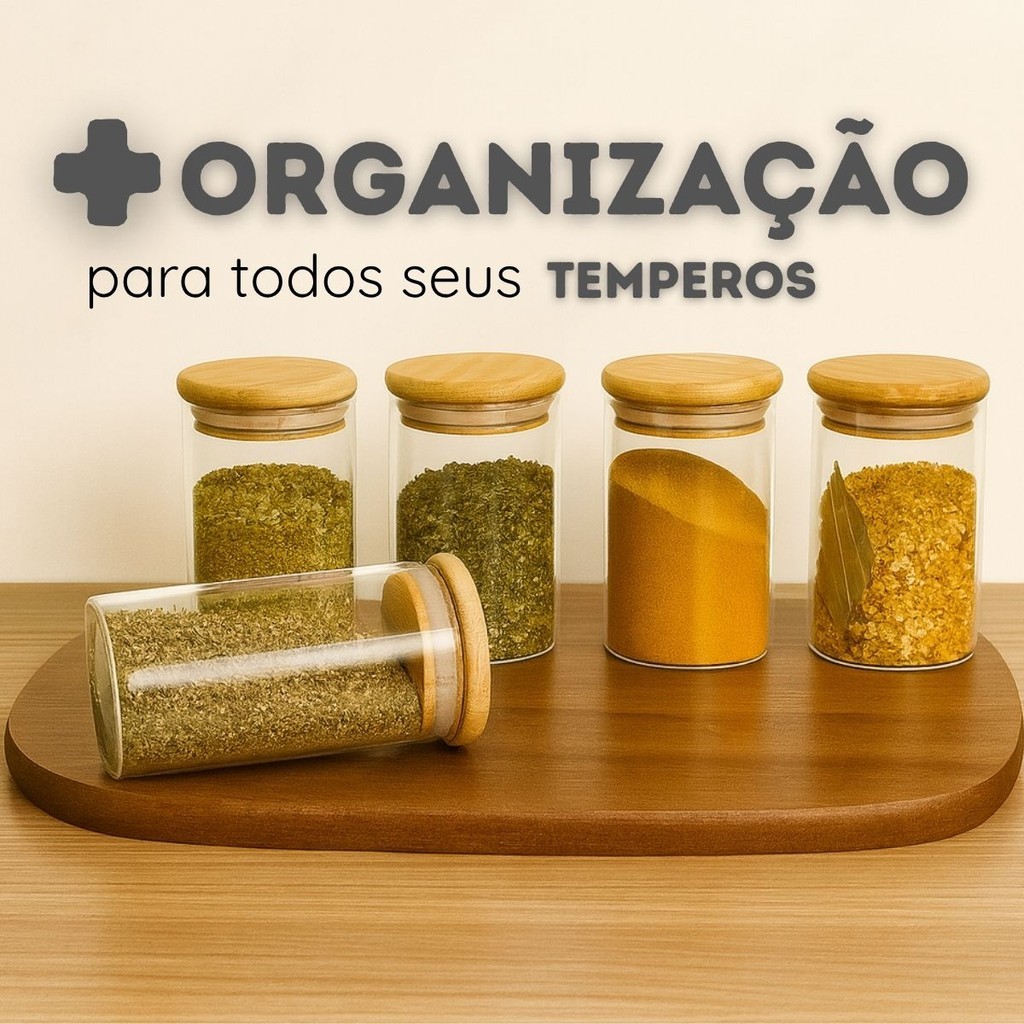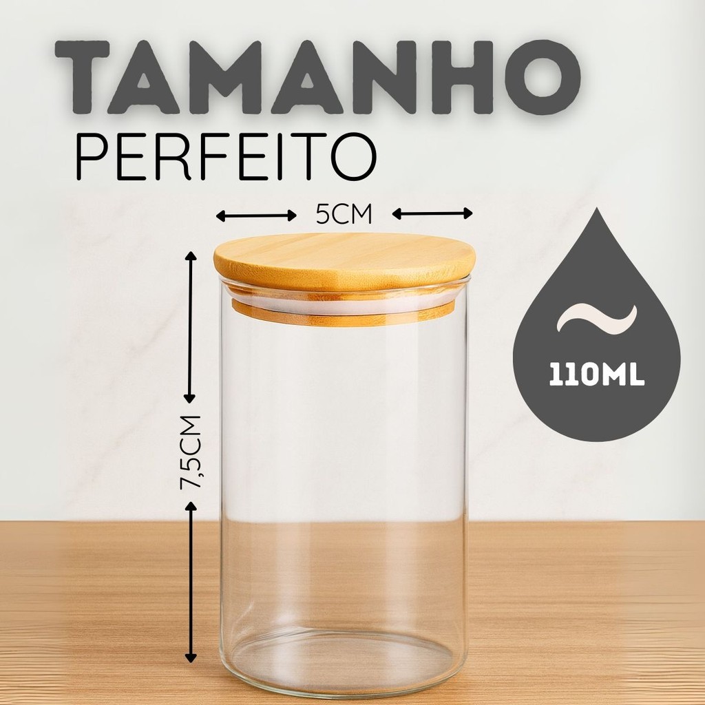 Kit 10 Potes de Vidro Herméticos 110 / 250 ml – Tampa Bambu para Temperos / Mantimentos