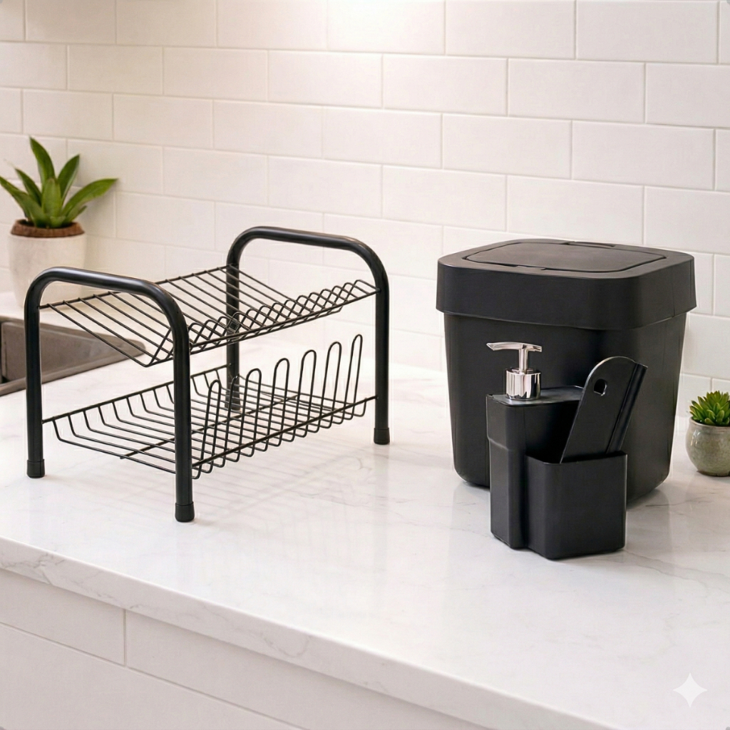 Kit Lixeira Pia De Cozinha 4 Litros E Dispenser Porta Deterente Sabão Bucha Luxo Pequena Kit Organizador Pia Lixeirinha