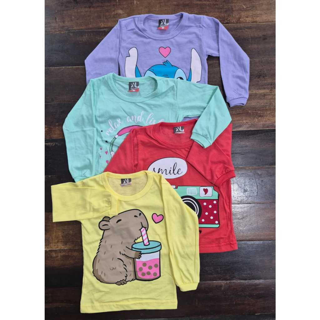 Kit 5 Camiseta Infantil Menina Manga Longa Inverno Cores e Estampas Sortidas 01 ao 03 100% Algodão