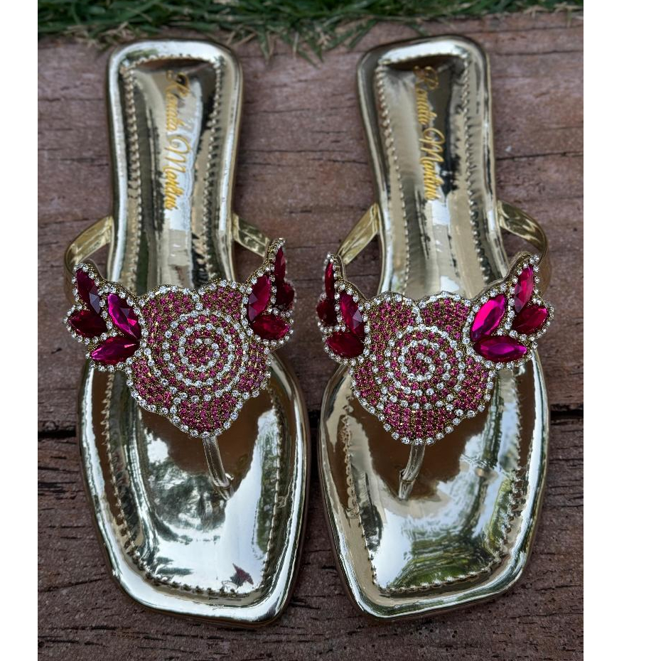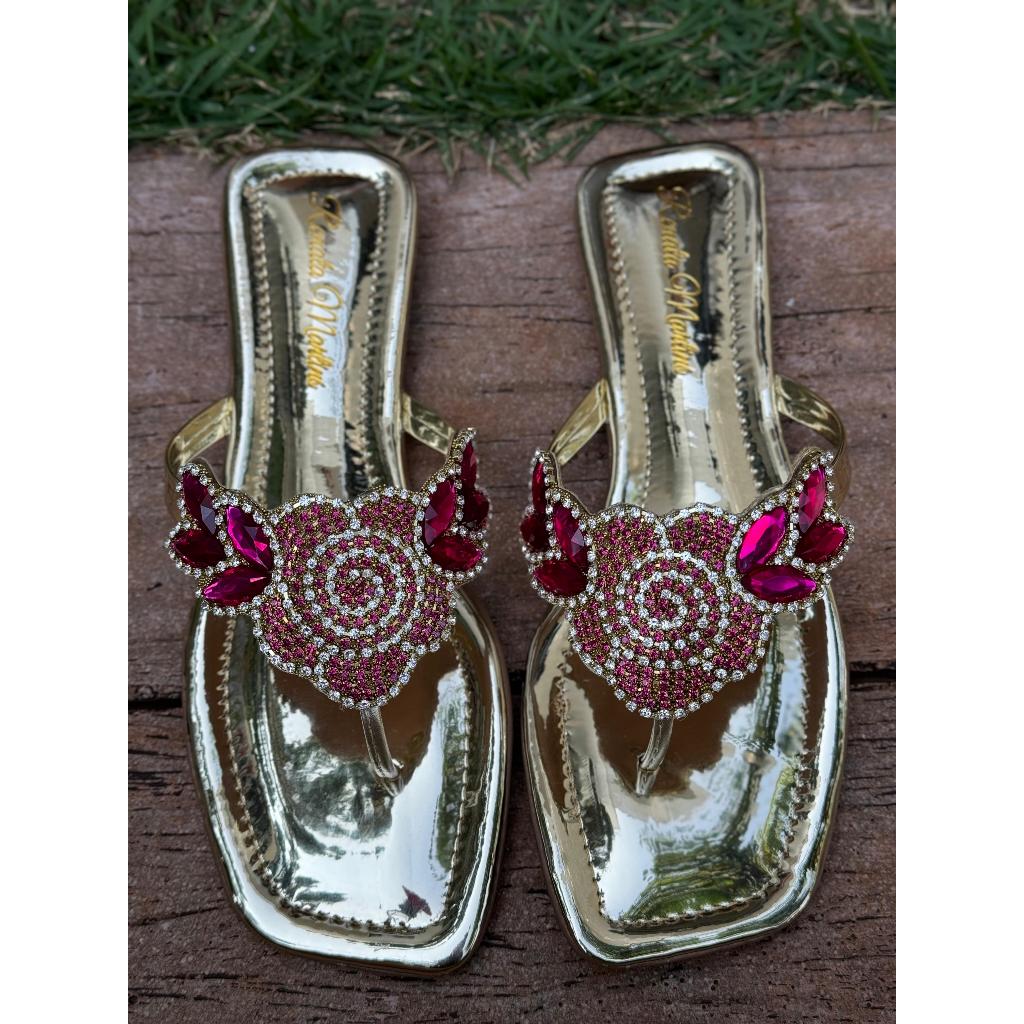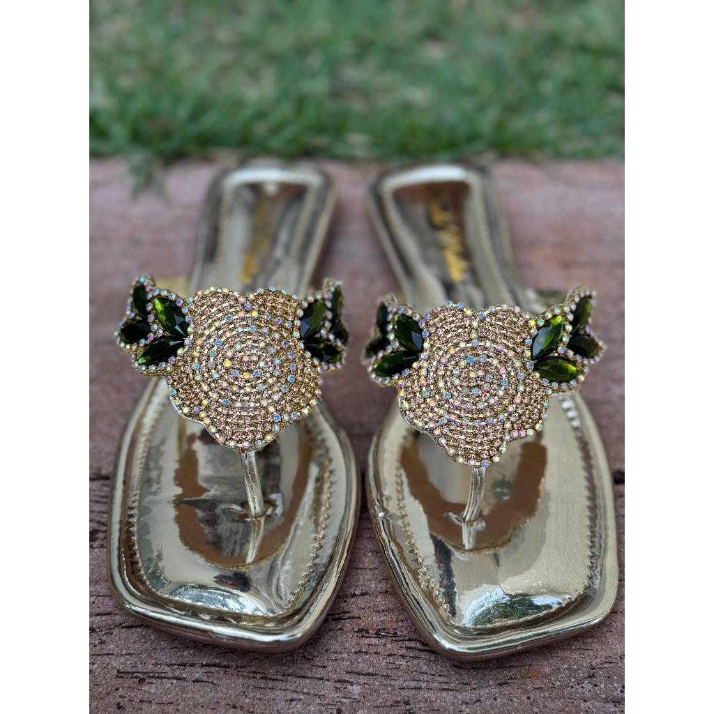 Sandália Feminina Rasteirinha Metalizada com Pedraria Folhas Coloridas super Confortável