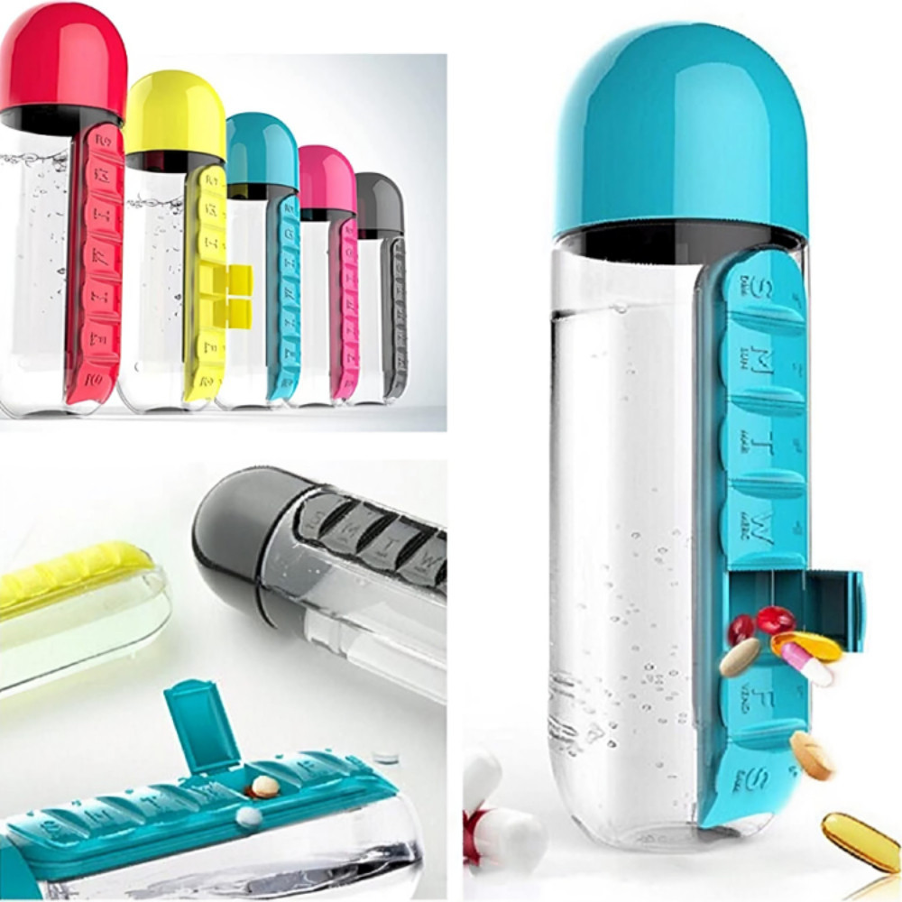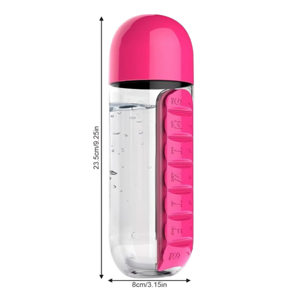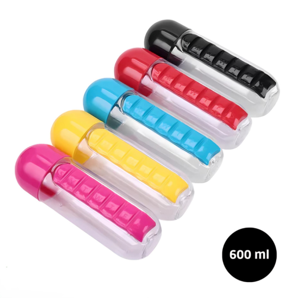 Garrafa para Academia Fitness de Água com Porta Comprimidos 600ML Lembrete de Comprimidos
