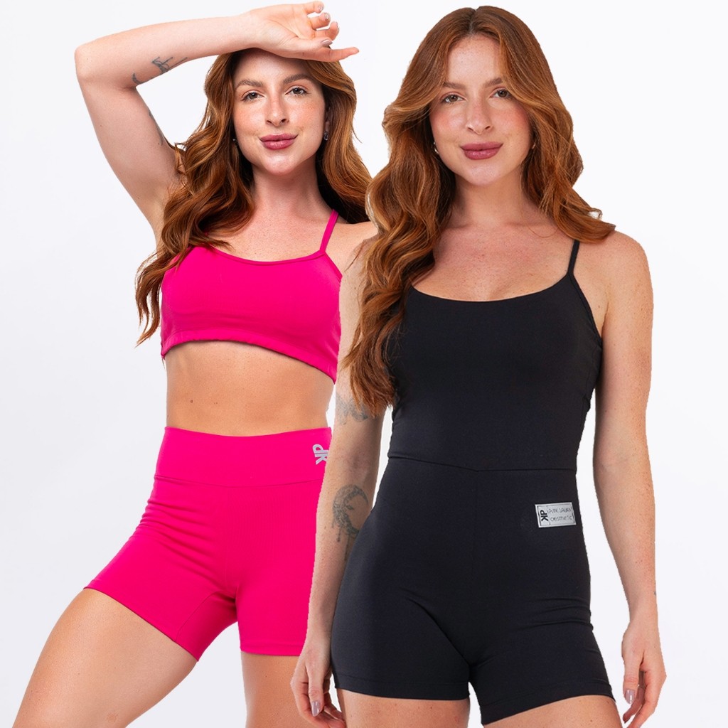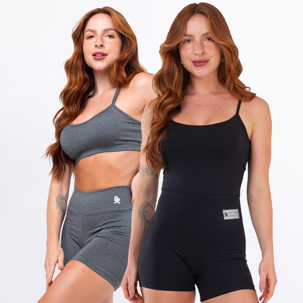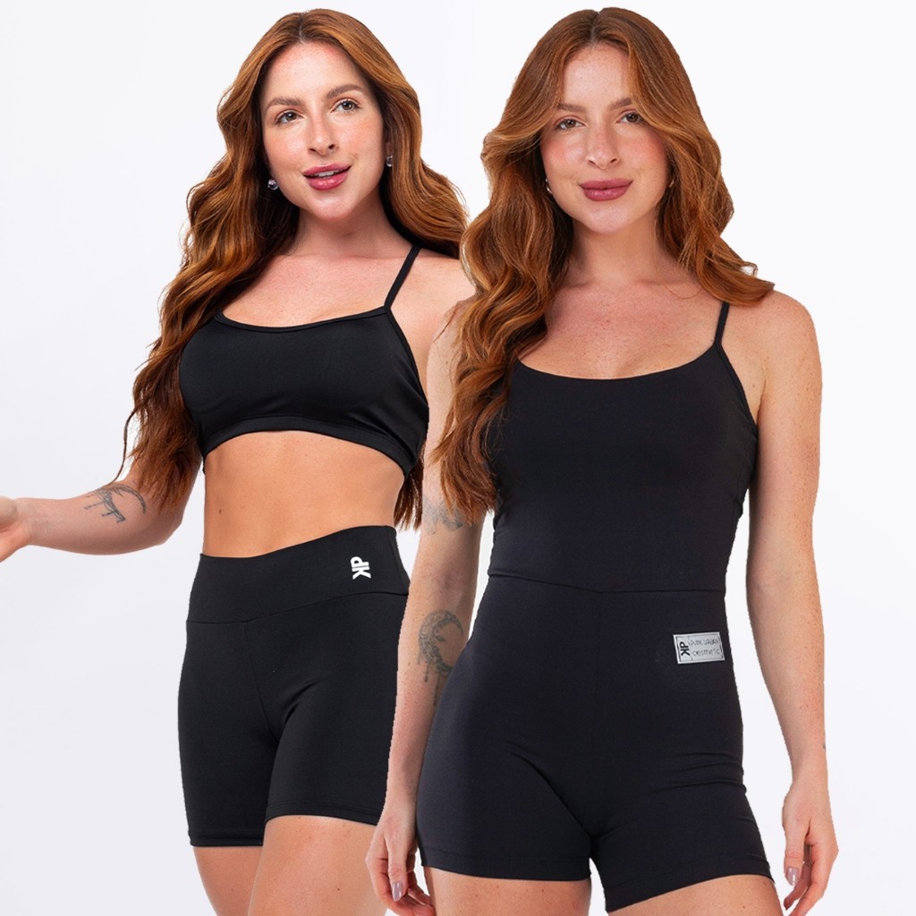Kit Macaquinho Alcinha Costa Nua + Conjunto Fitness Top Alça Short Meia Coxa Zero Transparência