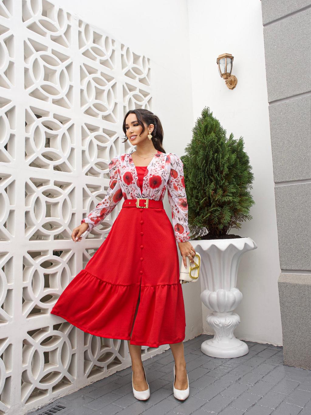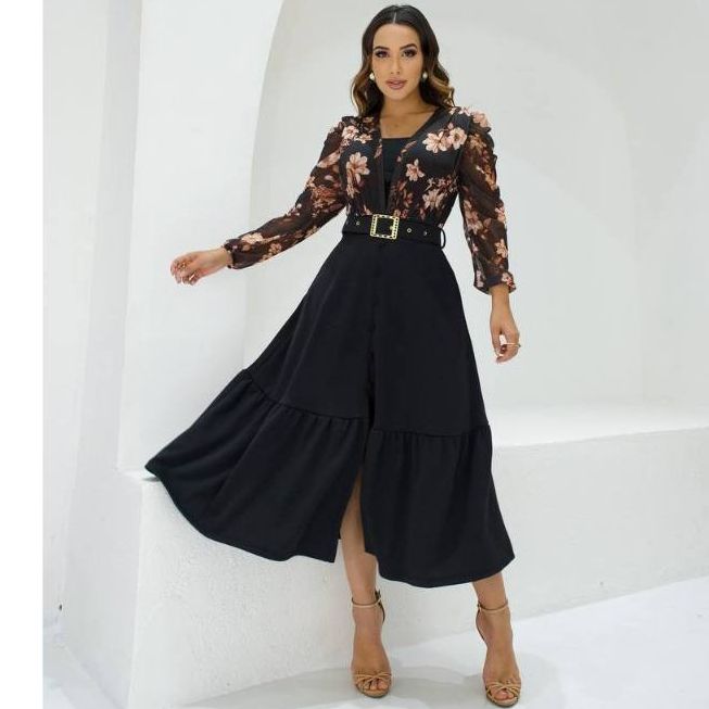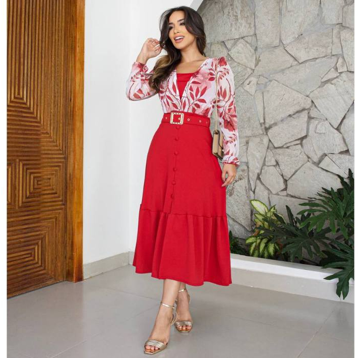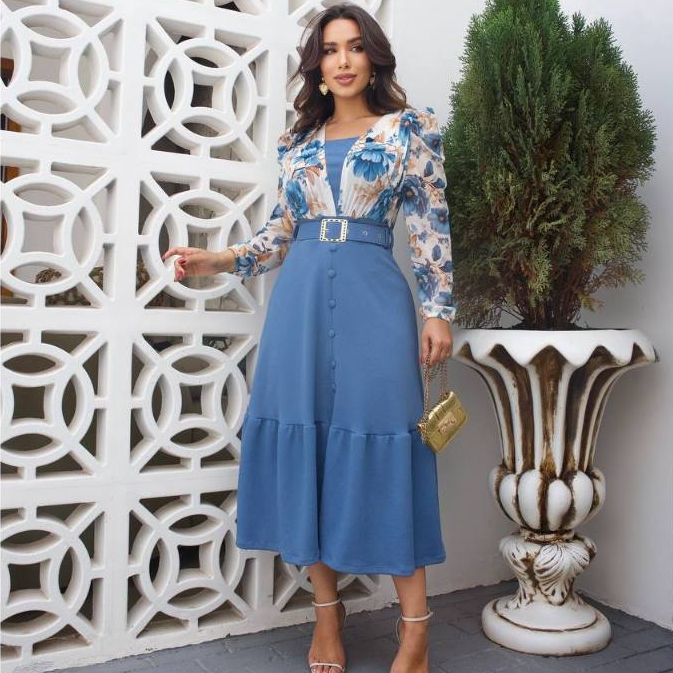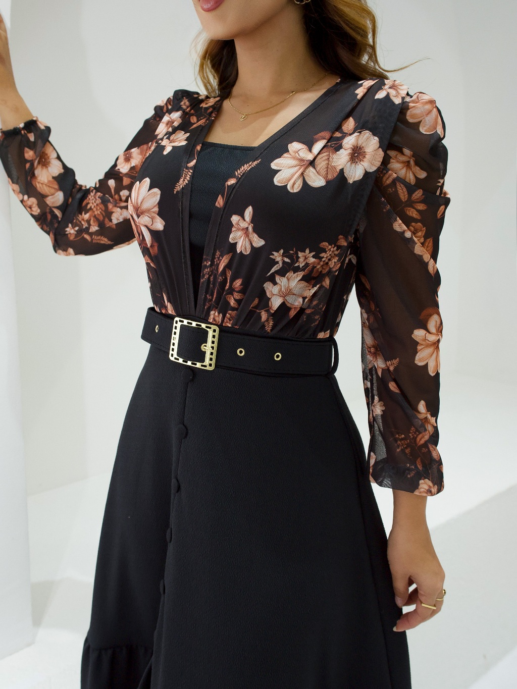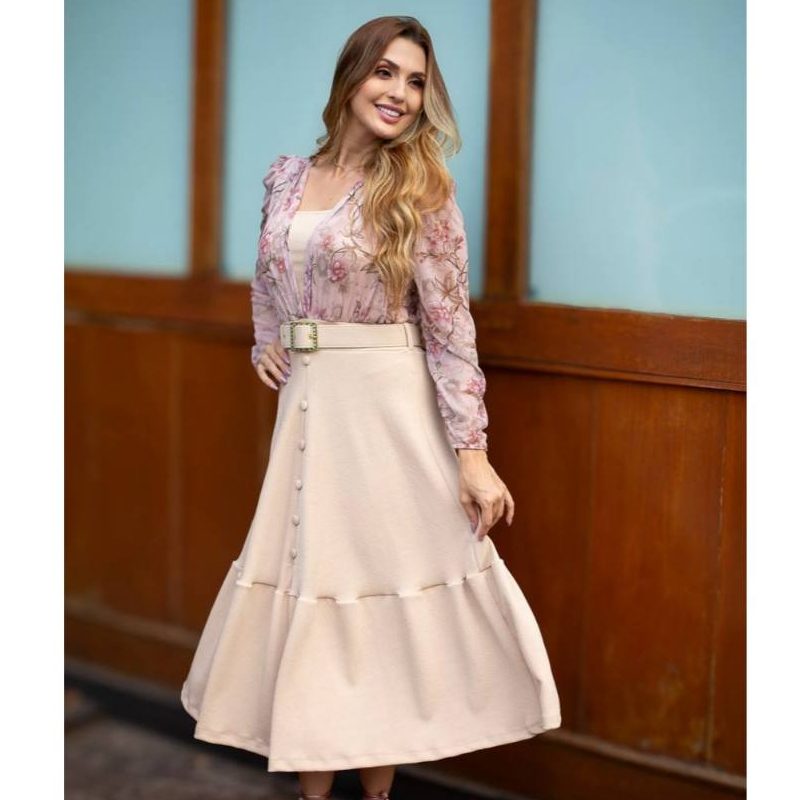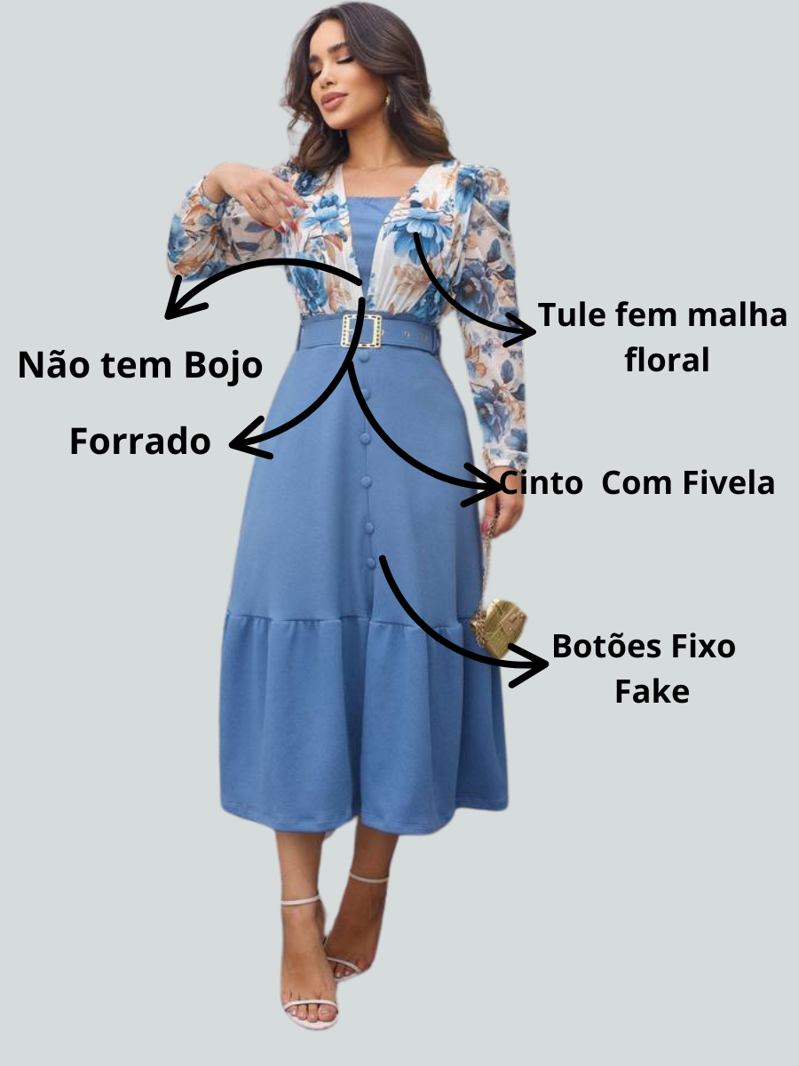 Vestido Max Midi Modesto Comportado Malha com Tule Estampado e Botões Moda Evangélica