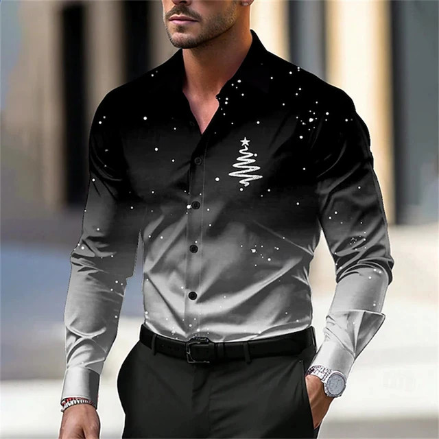 2025 Nova Impressão Gradiente Camisa De Natal Masculina Casual Moda Festa Manga Longa Botão Até Férias
