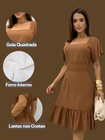 Vestido Feminino Curto com Manga Social Elegante Liso Cintura Marcada Trabalho Aniversário