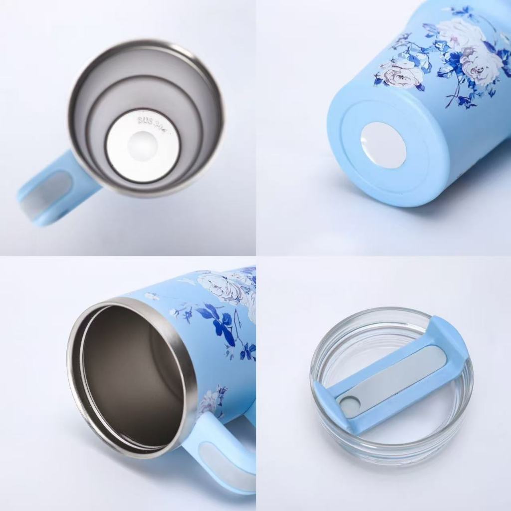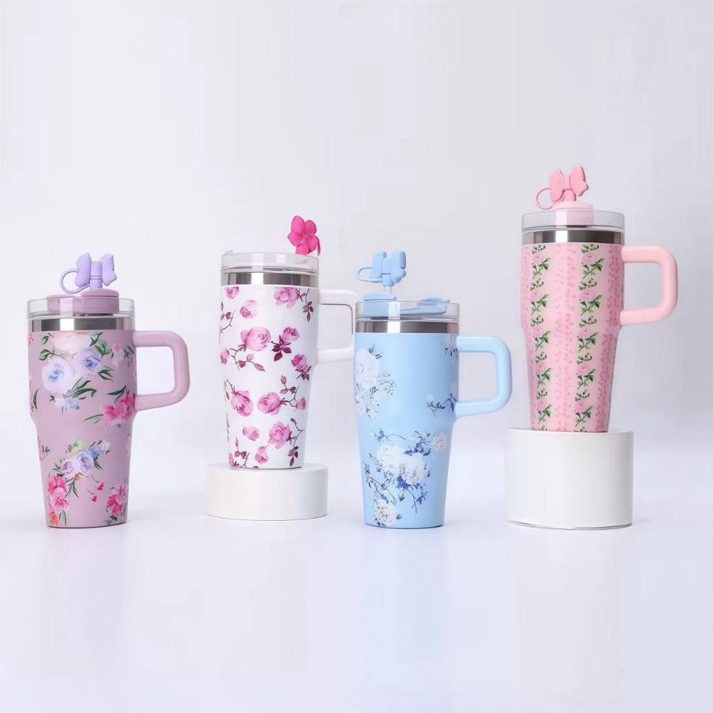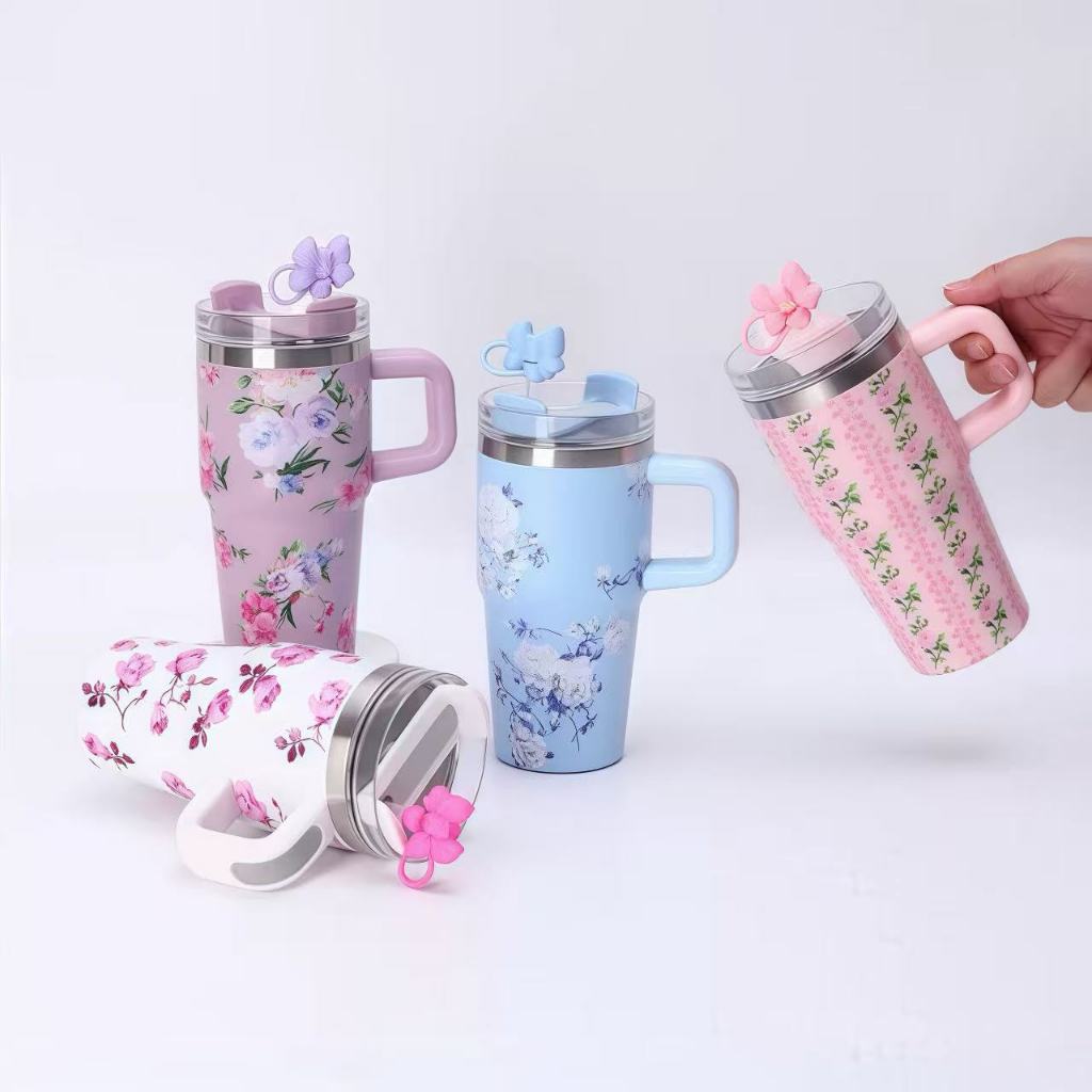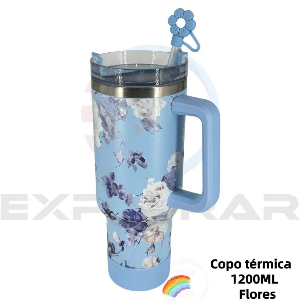Copo Garrafa Térmico Inox Portátil 600ML 1200ML Com Canudo Alça Desenho de flores para Crianças