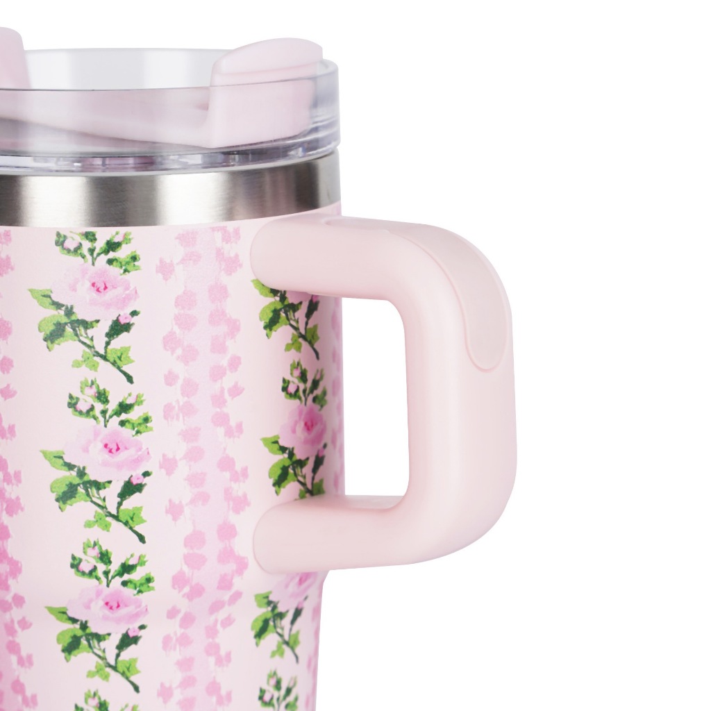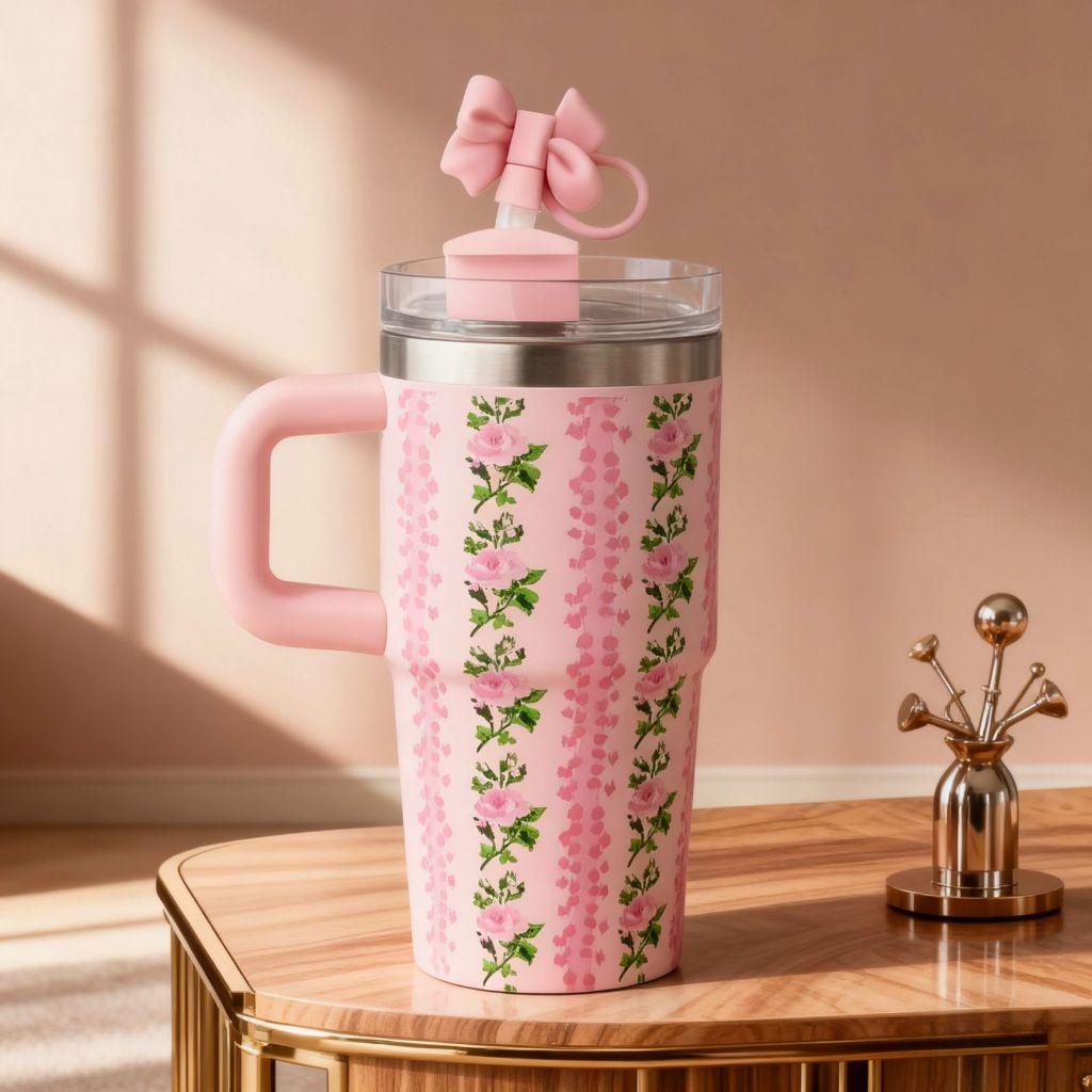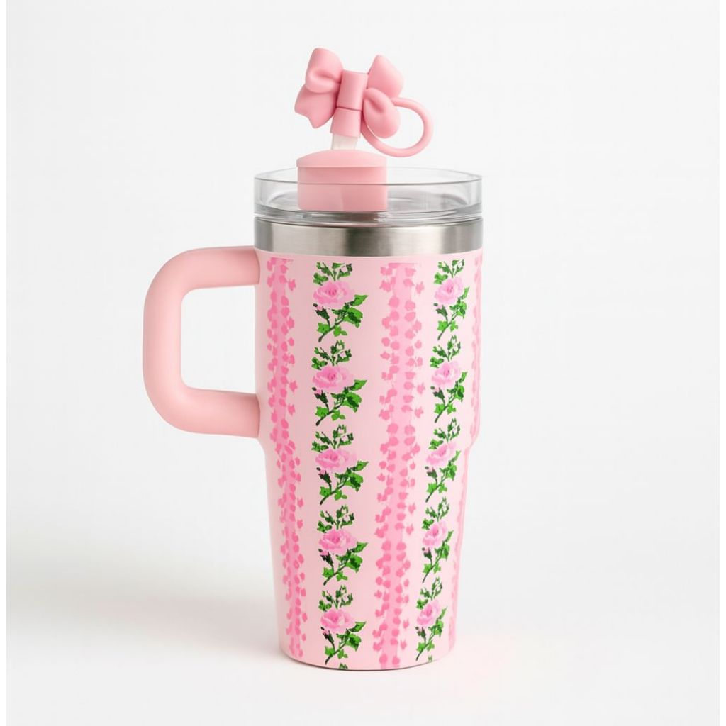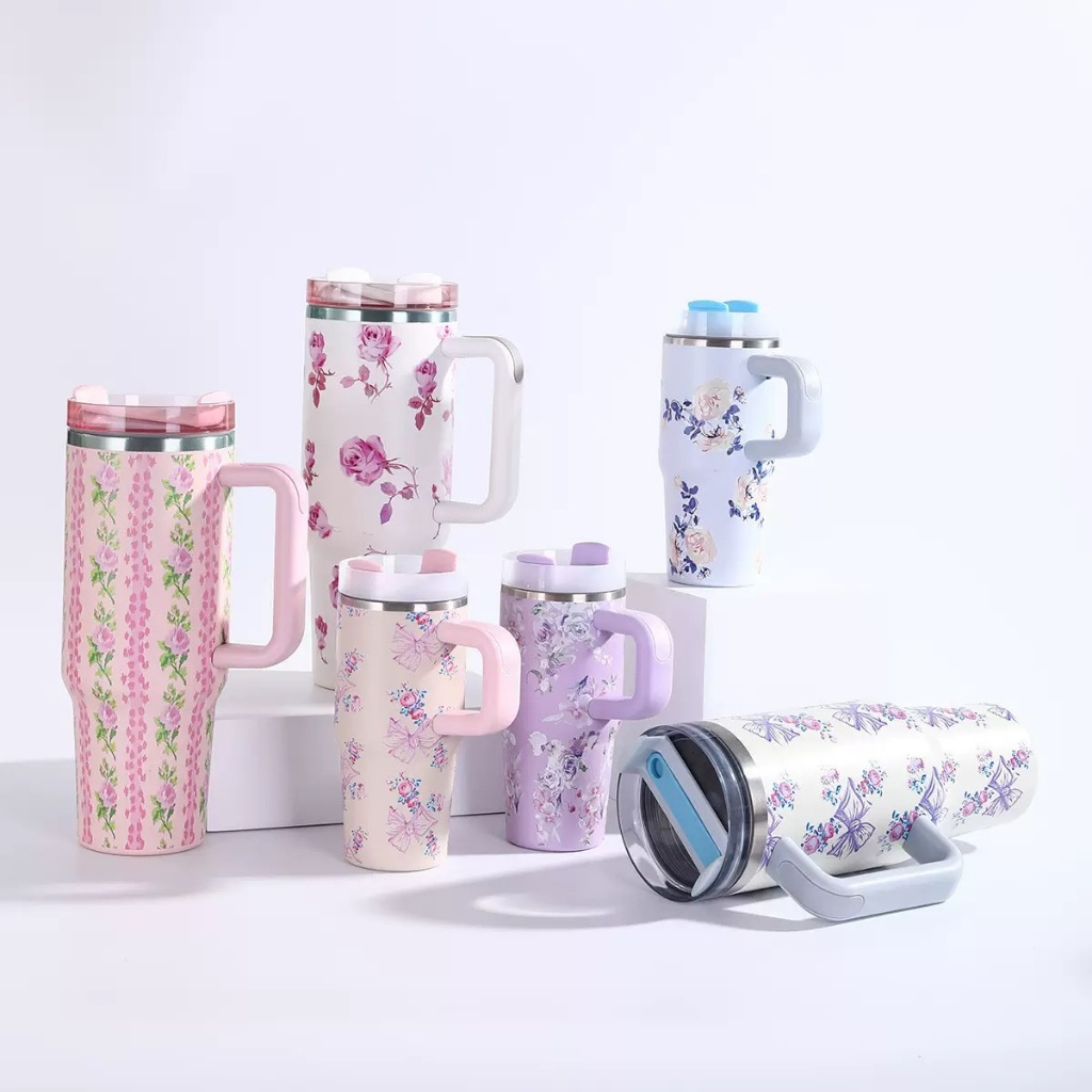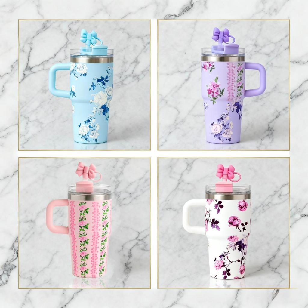 Copo Garrafa Térmico Inox Portátil 600ML 1200ML Com Canudo Alça Desenho de flores para Crianças