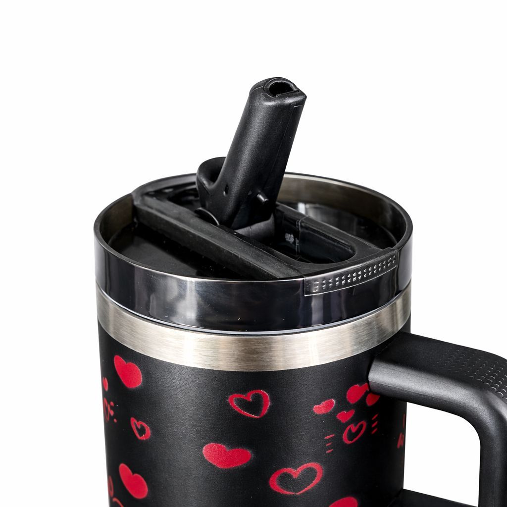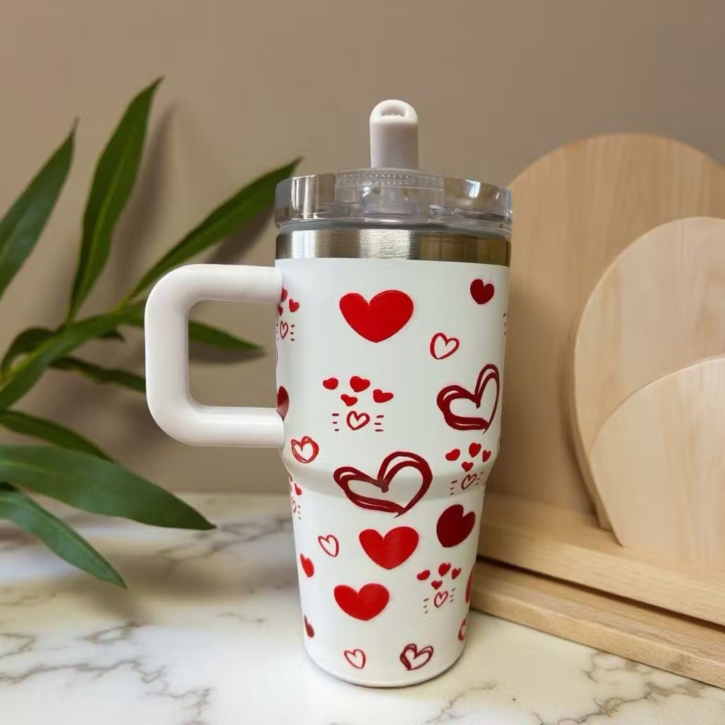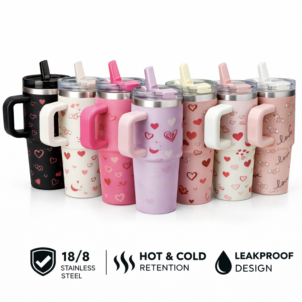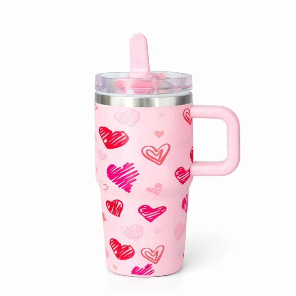 Copo Garrafa Térmico 600ml Estampa de Corações Com Canudo Chupeta Alça Para Crianças Escola Trabalho
