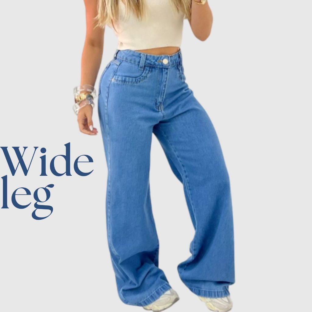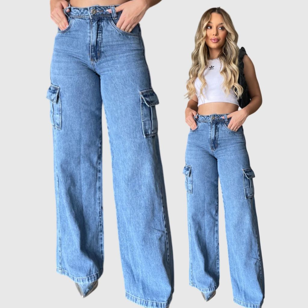 Calça Jeans Feminina Wide Leg Cargo Cintura Alta com Bolso tecido 100% Algodão