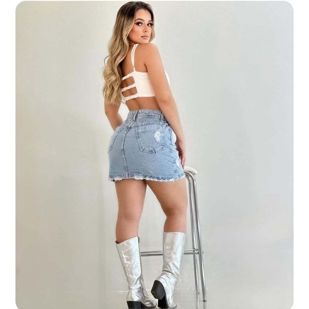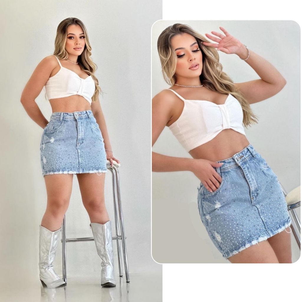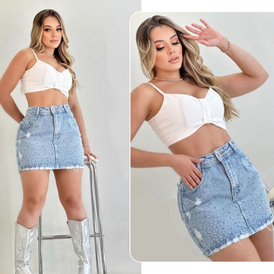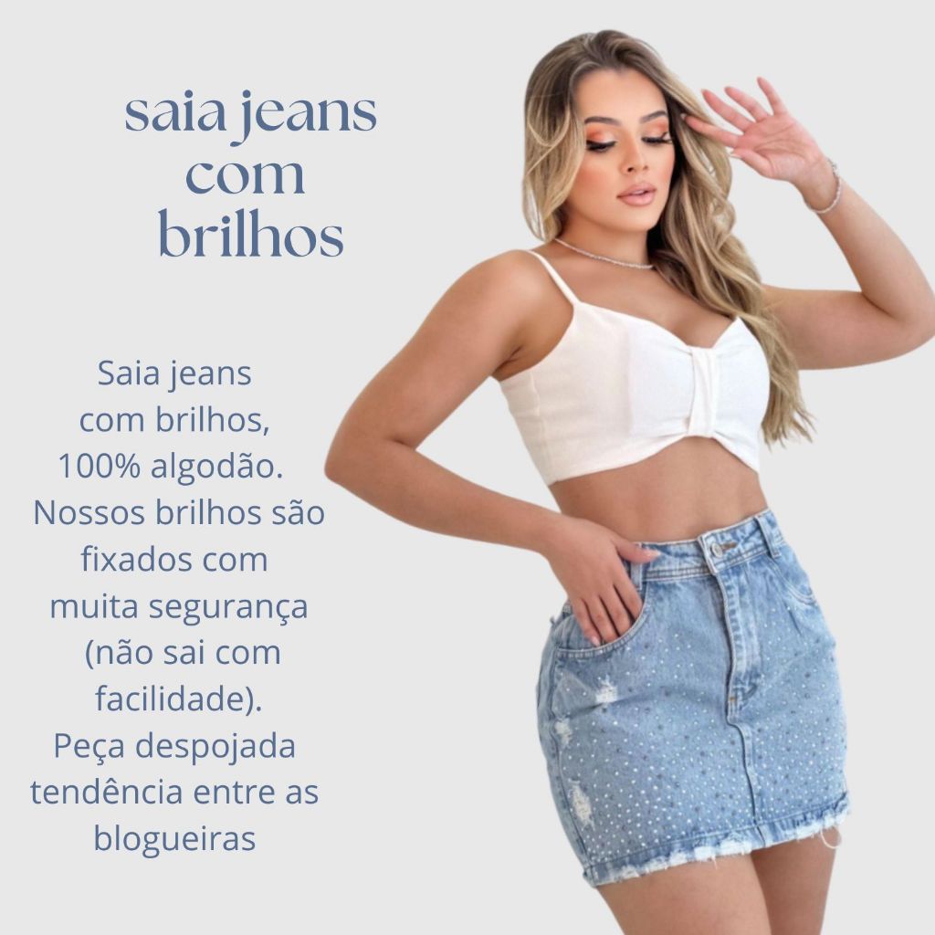 Saia Jeans Feminina Curta Com Brilhos Tecido 100% Algodão