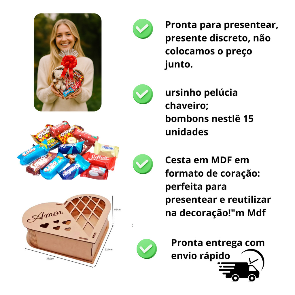 Cesta De Coração mdf presente / Com Chocolates e ursinho pelúcia cafe da manhã namorada