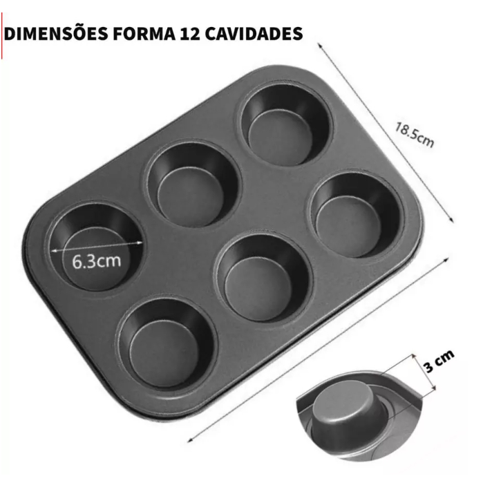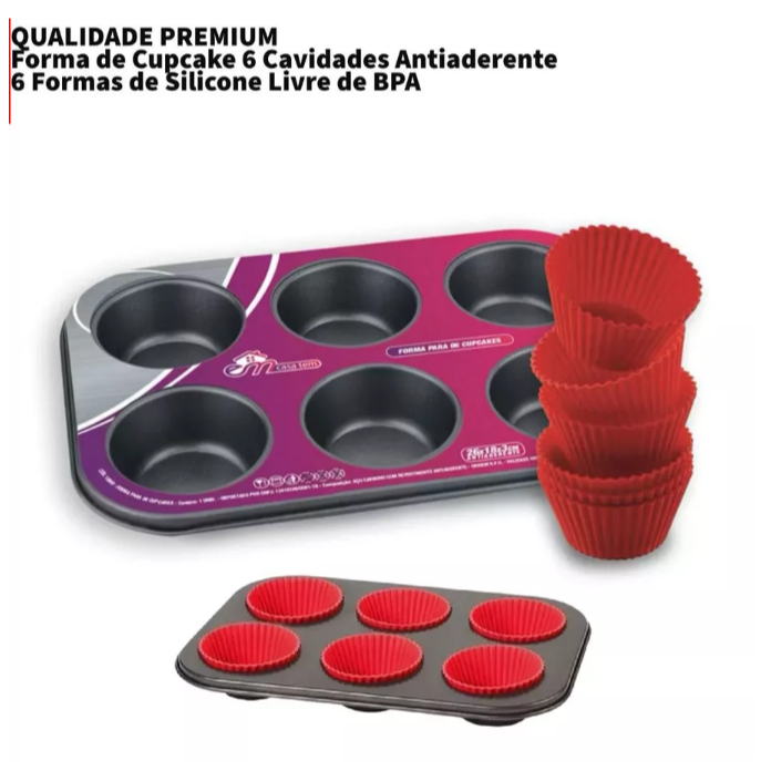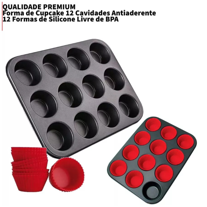 Kit 12 ou 6 Forminhas de Silicone Não Gruda + Forma de Cupcake 12 ou 6 Cavidades Antiaderente Empada
