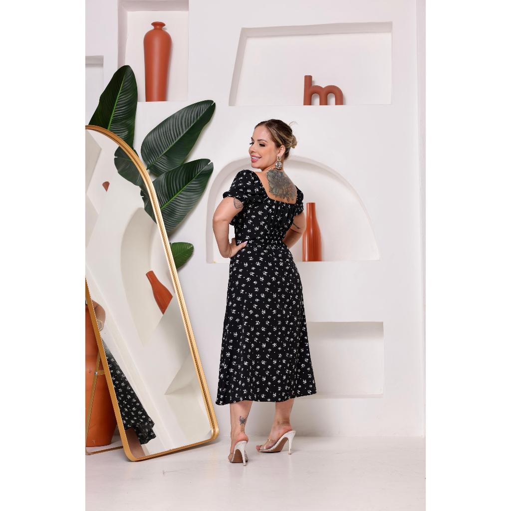 Vestido Midi Feminino Camponesa Estampa Floral Manga Curta.
