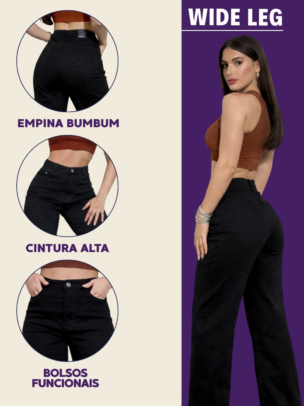 Calça Jeans Feminina Wide Leg Preta Cintura Alta Pantalona Boca Larga Tecido Encorpado 100% Premium