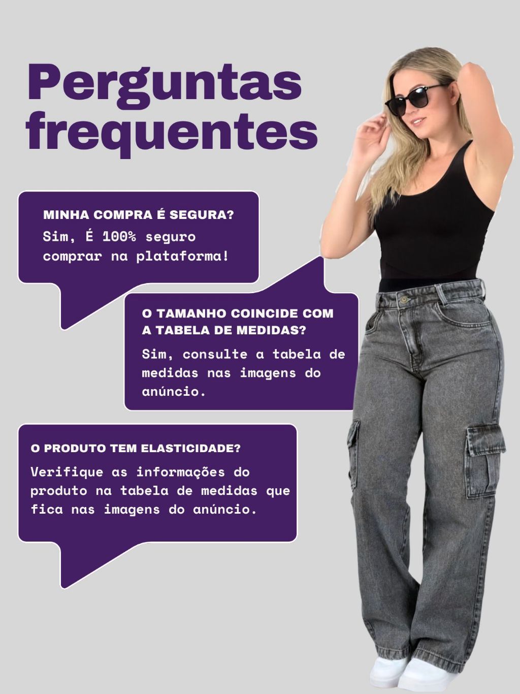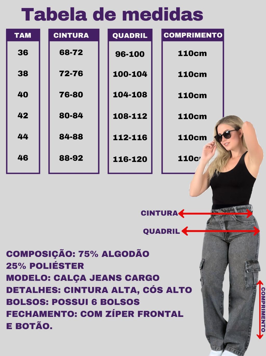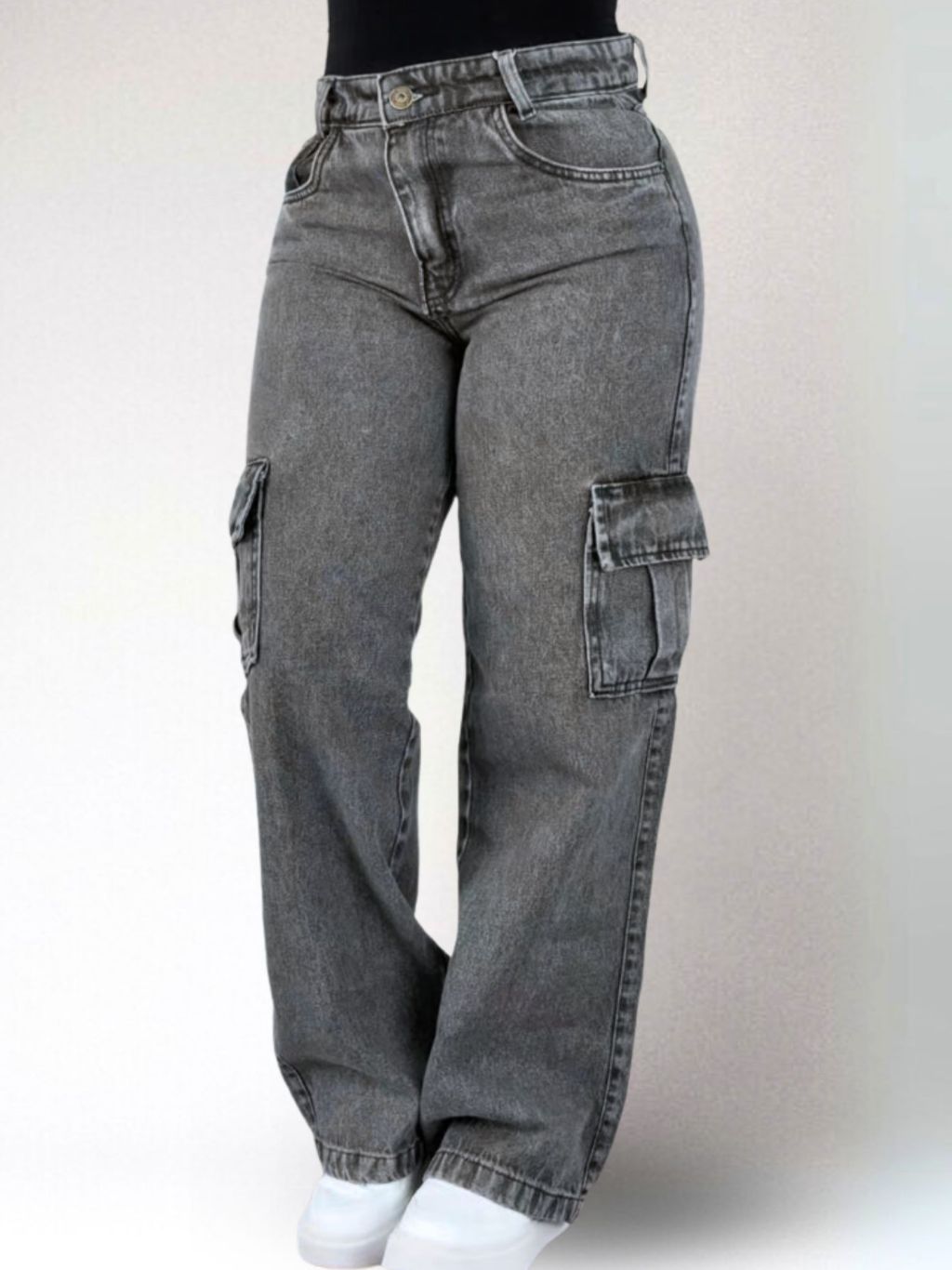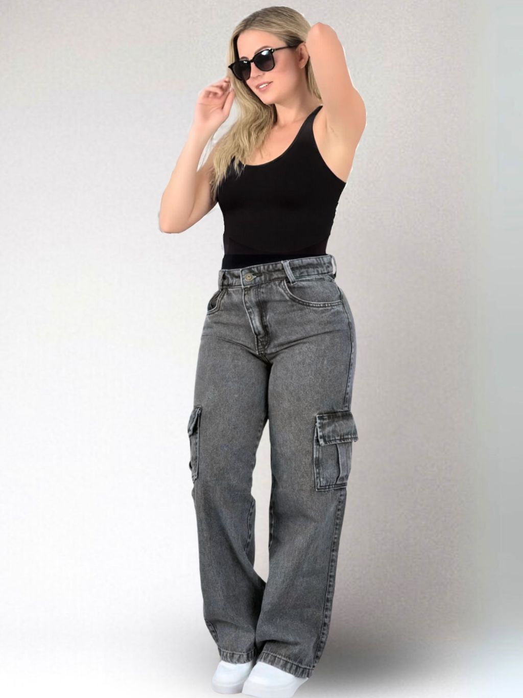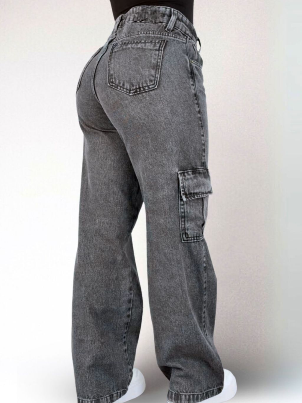 Calça Cargo Jeans Feminina Wide Leg grafite tecido algodão cintura alta cinza moda blogueira