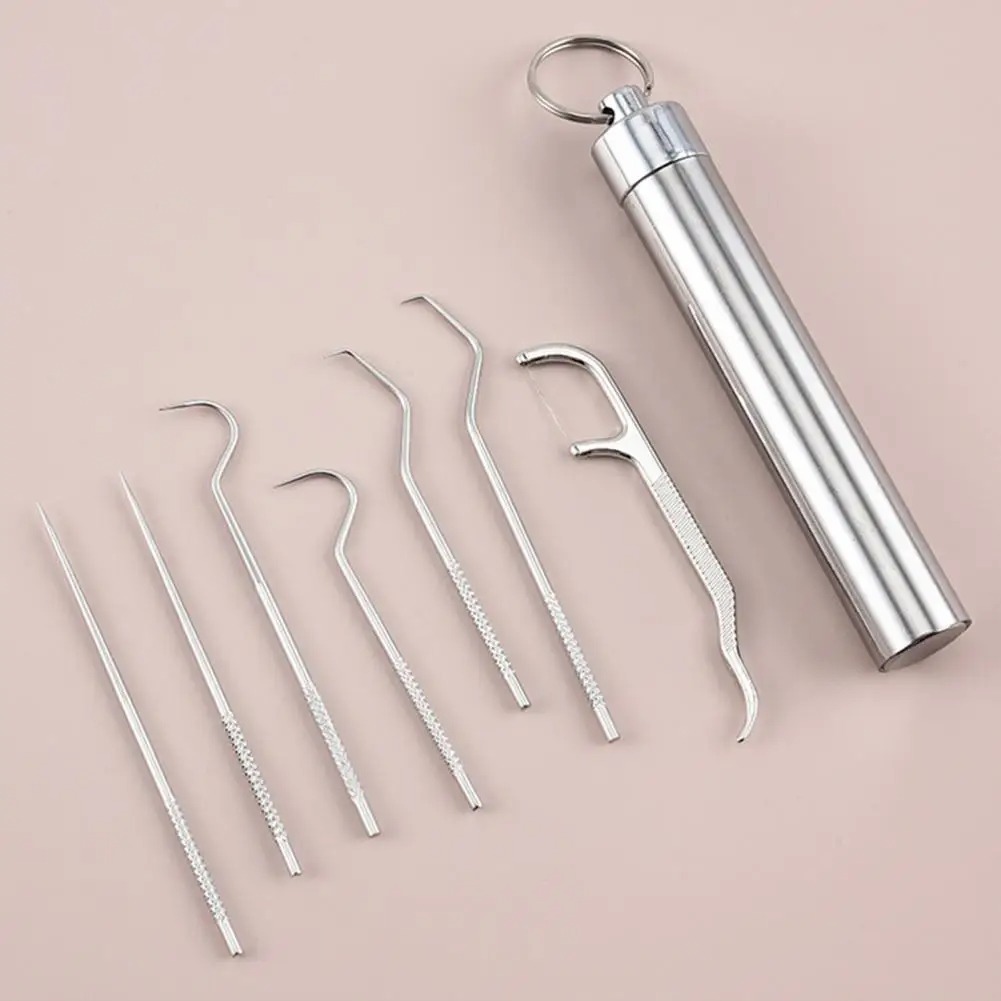 Kit 7 Peças De Limpeza Dental Aço Inoxidável + Frasco de Armazenamento