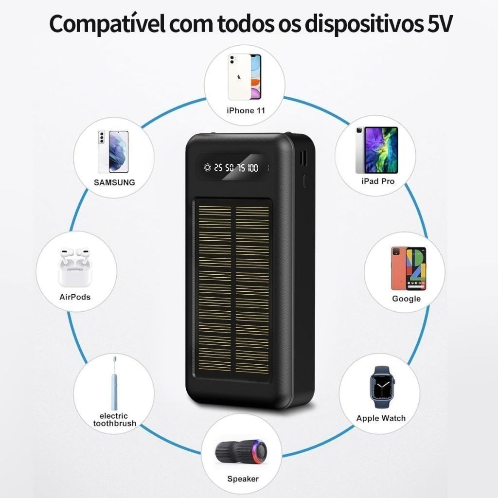 Carregador Portátil Power Bank Solar 20.000mah Com cabos 5 Em1 LED lanterna