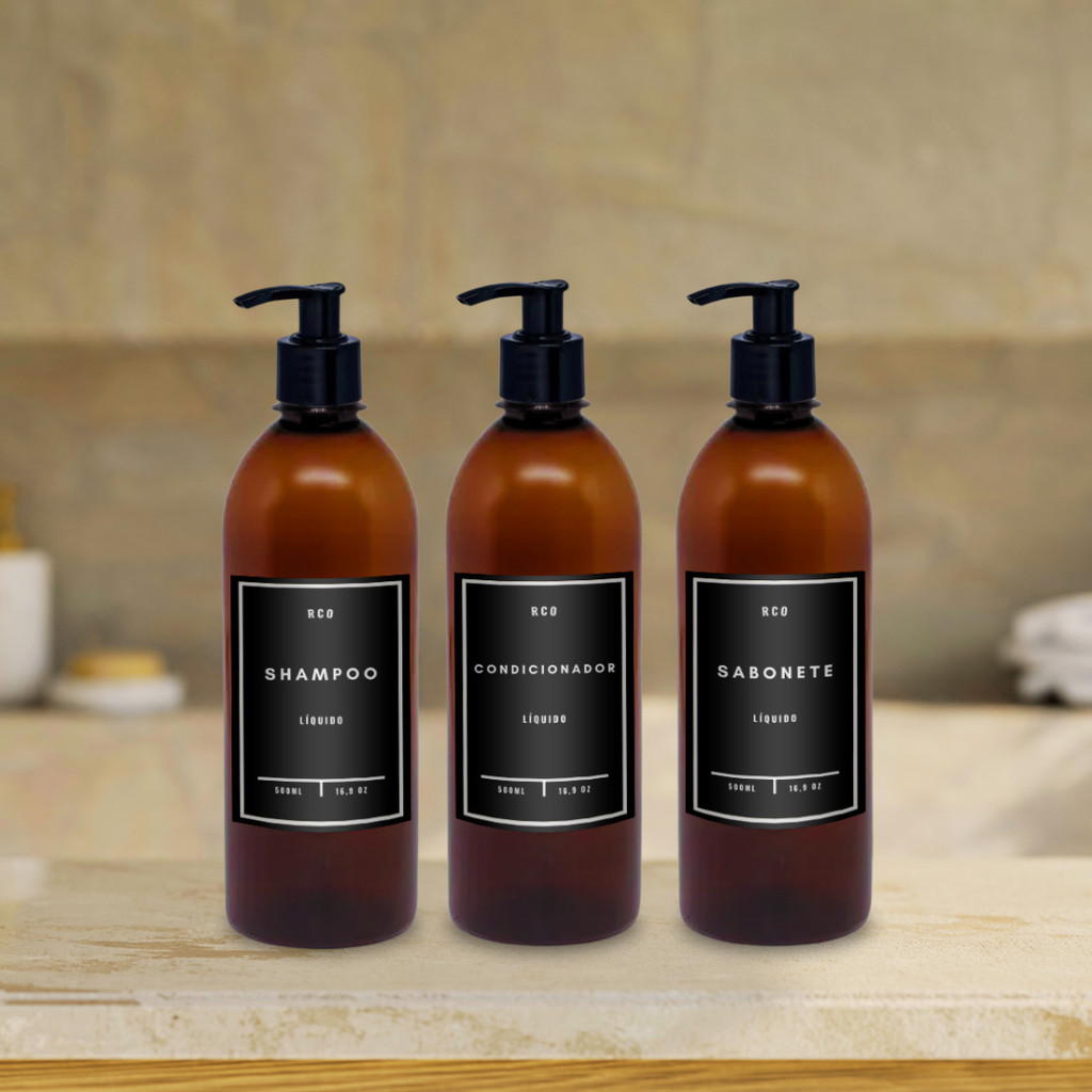 Kit Banho Frasco Pet Âmbar 3pçs Shampoo Condicionador e Sabonete líquido Dispenser 500ml