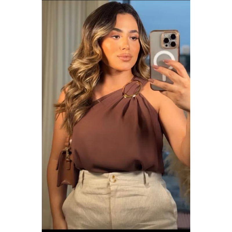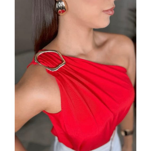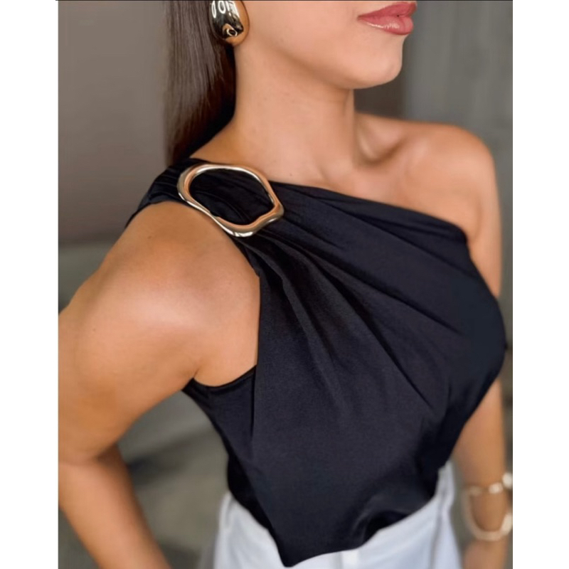 Blusa Feminina Crepe Duna Premium Decote de Um Obro Só Mula Manca Com Fivela Elegante Tendência Verão