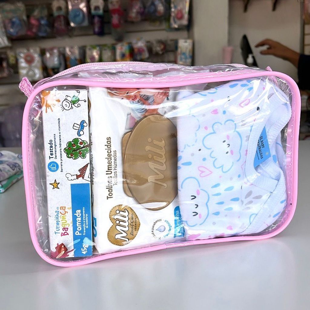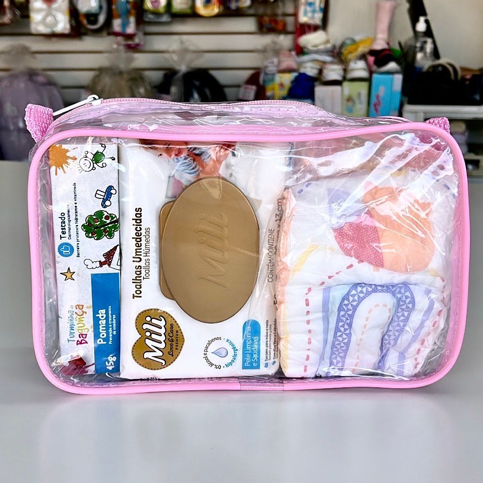 NECESSAIRE 23X15 TRANSPARENTE E ROSA MATERNIDADE HIGIENE PESSOAL BOLSA BEBÊ MAMÃE ORGANIZE BOLSINHA DIA ADIA FRALDA LENÇ