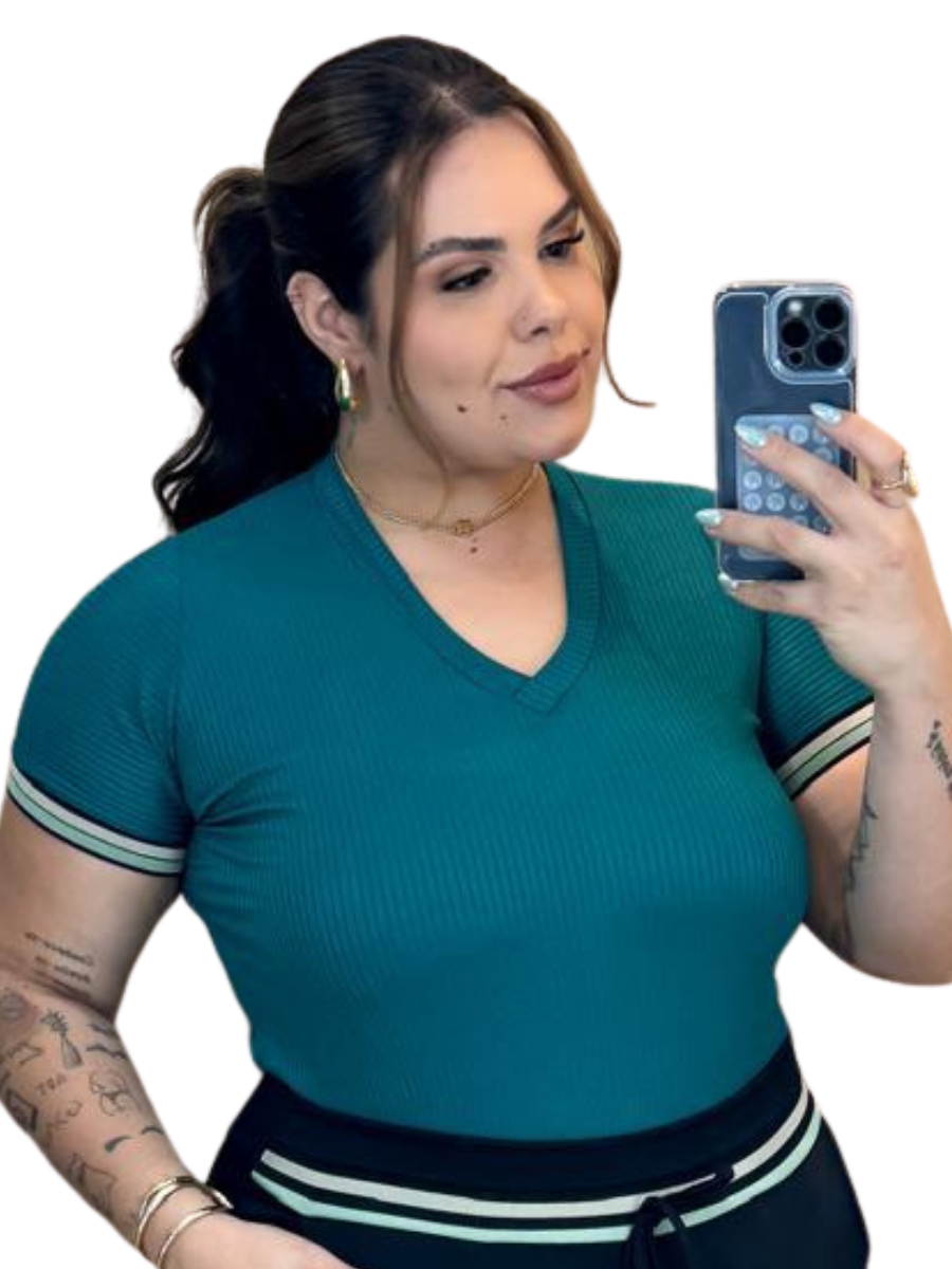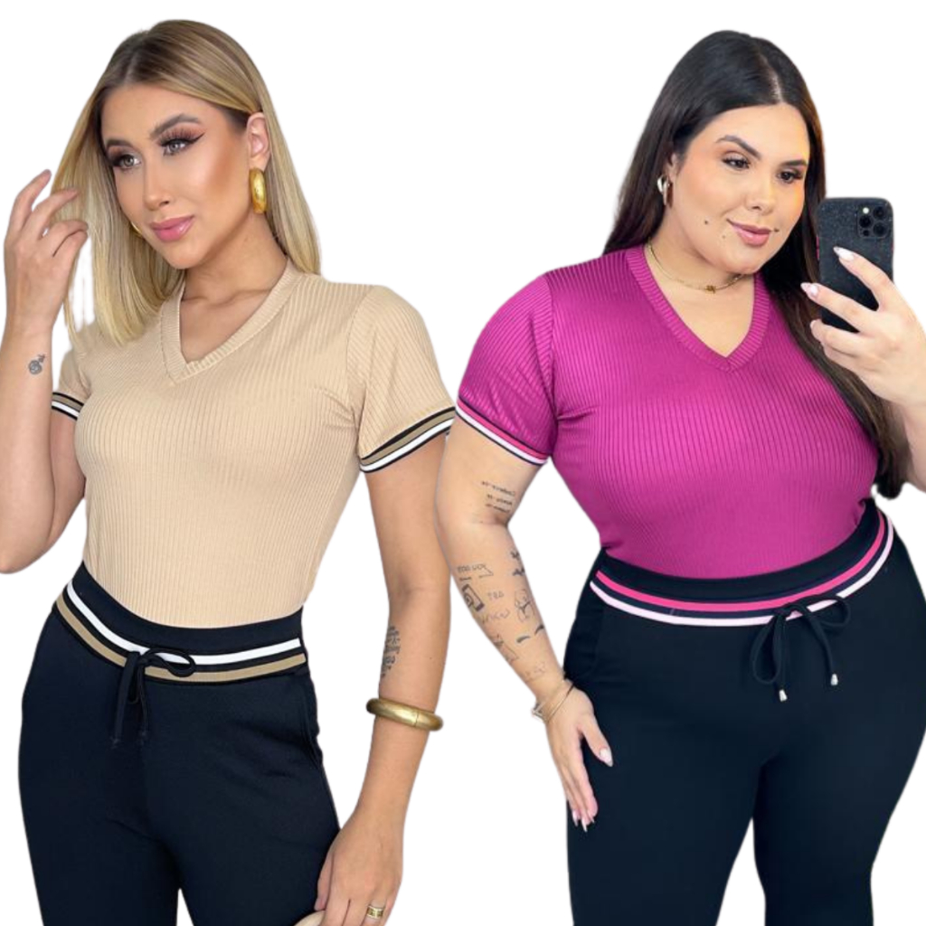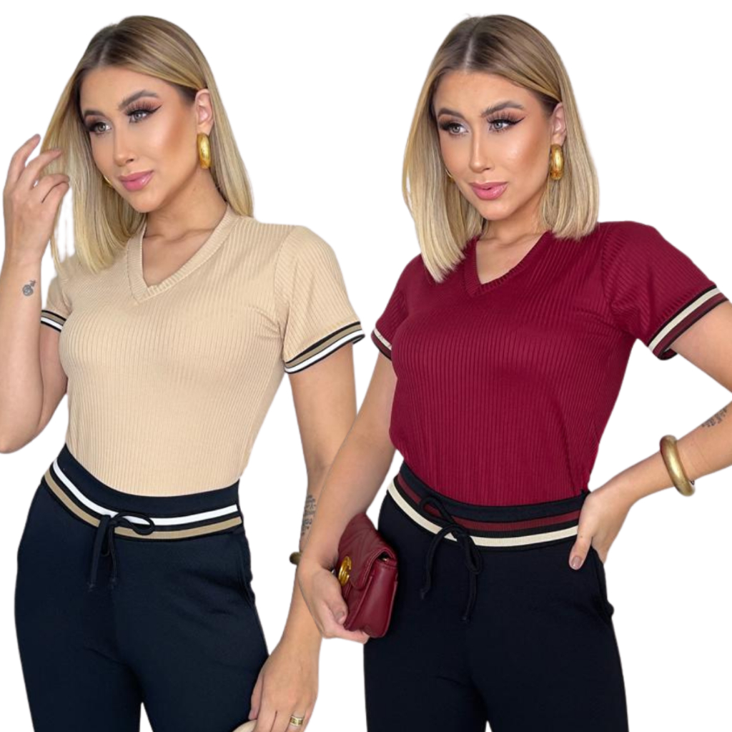 Kit Blusa Feminina Malha Canelada Gola V Manga Curta com Elastano casual dia dia